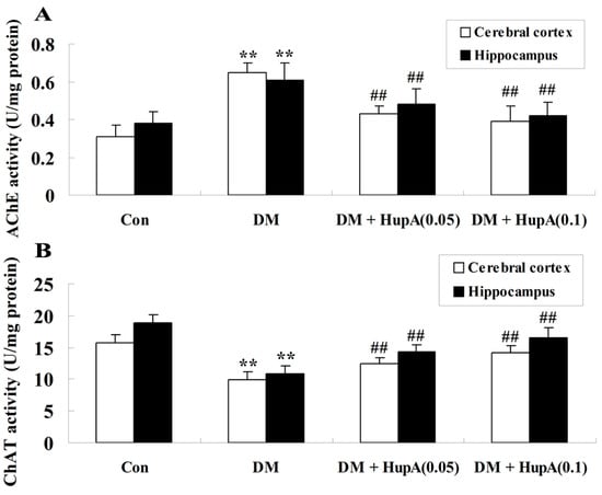 Effects of HupA on the activities of AChE (A) and ChAT (B) in cerebral cortex and hippocampus of control and diabetic rats (n = 8, mean ± S.D.). ** p < 0.01 compared with Con group; ## p < 0.01 compared with DM group. Con, control; DM, diabetes; DM + HupA (0.05), huperzine A (0.05 mg/kg)-treated; DM + HupA (0.1), huperzine A (0.1 mg/kg)-treated groups.
