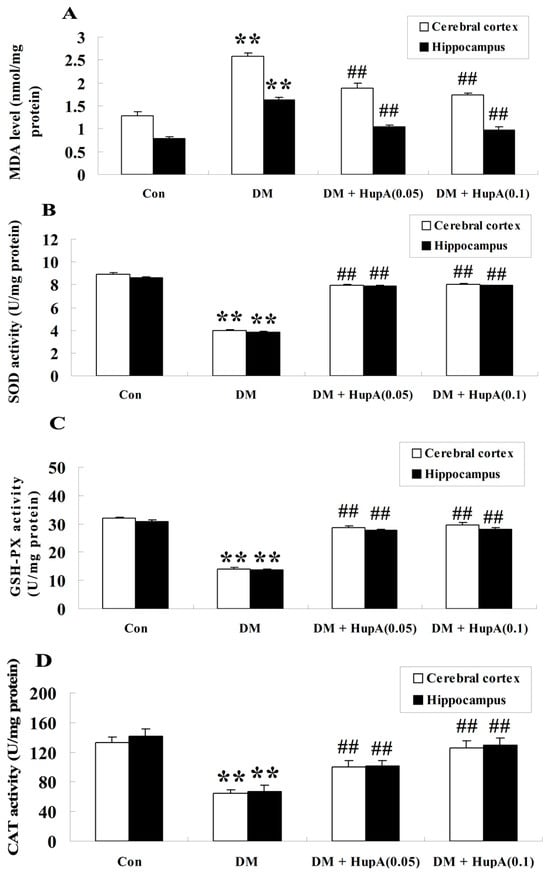 We subsequently investigated whether HupA influenced oxidative stress in the cerebral cortex and hippocampus of diabetic rat brain by detecting the level of MDA and anti-oxidant enzymes (SOD, GSH-PX and CAT). It was noted that STZ-induced diabetes markedly increased the oxidative production of MDA both in cerebral cortex and hippocampus (p < 0.01), compared to the age-matched control group (Figure 6A). Nevertheless, 7-week HupA statistically inhibited the content of MDA in diabetic rat brain. Additionally, the activities of all detected anti-oxidant enzymes including SOD, GSH-PX and CAT were significantly diminished in diabetes-induced rats (p < 0.01) compared with controls (Figure 6B–D). Chronic treatment with HupA dose-dependently augmented these values both in the cerebral cortex and hippocampus of diabetic rat brain.