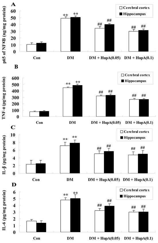 The effects of HupA on the inflammation induced by diabetes were also detected in our present study. It is interesting that the activities of major inflammatory factors including NF-κB, TNF-α, IL-1β and IL-6 were found to be notably elevated in the cerebral cortex and hippocampus of STZ-injected rats (p < 0.01), compared to those of the control group (Figure 7A–D). HupA (0.05 and 0.1 mg/kg) treatment markedly and dose-dependently suppressed inflammatory responses in different regions of diabetic rat brain.