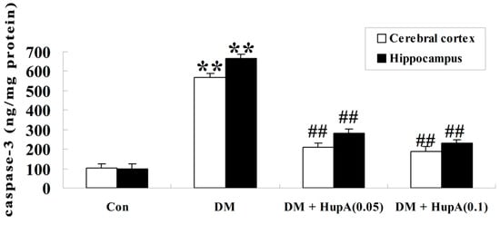 Oxidative stress could seriously contribute to mitochondrial dysfunction and ultimately trigger a series of caspase-activated apoptotic cascades in neurons []. Caspase-3 is regarded as an indicator of apoptosis. Our present investigation showed the remarkable elevation of caspase-3 activity in the cerebral cortex and hippocampus of diabetic rat brain and this effect was blocked by HupA treatment, implicating that HupA decreased neuronal death in a diabetic rat model. Consistently, it was previously illustrated that HupA attenuated caspase-dependent neuronal apoptosis in the hippocampus of rats during acute hypobaric hypoxia []. Moreover, HupA treatment also ameliorated serum deprivation-induced apoptosis via inhibiting mitochondria-dependent caspase-3 activity in cultures of rat cortical neurons [].