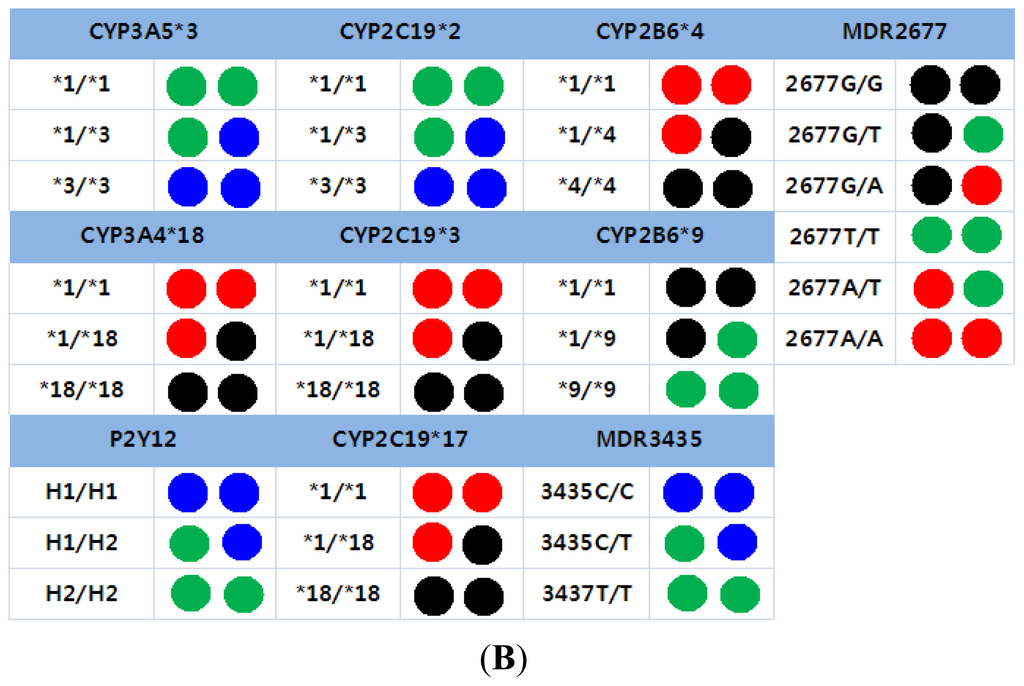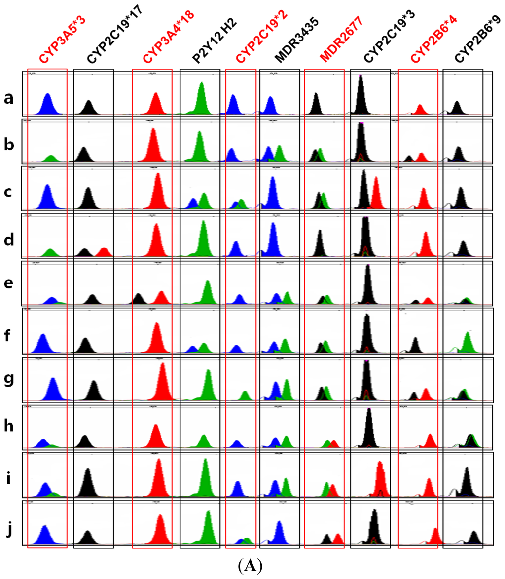 (A) Representatives of electropherograms obtained from multiplex single-base extension. The detected variant alleles are shown above the peaks (Green: A, Red: T, Blue: G, and Black: C). Genotypes of ten samples are illustrated as representative results. (a) CYP2B6 *1/*1, CYP2C19 *1/*1, CYP3A4 *1/*1, CYP3A5 *3/*3, MDR1 2677 G/G, MDR1 3435 C/C, and P2Y12 H1/H1; (b) CYP2B6 *1/*4, CYP2C19 *1/*1, CYP3A4 *1/*1, CYP3A5 *1/*1, MDR1 2677 G/T, MDR1 3435C/T, and P2Y12 H1/H1; (c) CYP2B6 *1/*1, CYP2C19 *2/*3, CYP3A4 *1/*1, CYP3A5 *3/*3, MDR1 2677G/T, MDR1 3435C/C, and P2Y12 H1/H2; (d) CYP2B6 *1/*1, CYP2C19 *1/*17, CYP3A4 *1/*1, CYP3A5 *1/*1, MDR1 2677 G/G, MDR1 3435 C/C, and P2Y12 H1/H1; (e) CYP2B6 *1/*6, CYP2C19 *1/*1, CYP3A4 *1/*18, CYP3A5 *1/*3, MDR1 2677 G/T, MDR1 3435 C/T, and P2Y12 H1/H1; (f) CYP2B6 *6/*6, CYP2C19 *1/*2, CYP3A4 *1/*1, CYP3A5 *3/*3, MDR1 2677 G/T, MDR1 3435 C/T, and P2Y12 H1/H2 (g) CYP2B6 *1/*6, CYP2C19 *2/*2, CYP3A4 *1/*1, CYP3A5 *3/*3, MDR1 2677 G/T, MDR1 3435 C/T, P2Y12 H1/H1; (h) CYP2B6 *1/*9, CYP2C19 *1/*1, CYP3A4 *1/*1, CYP3A5 *1/*3, MDR1 2677 A/T, MDR1 3435C/T, and P2Y12 H1/H1; (i) CYP2B6 *1/*1, CYP2C19 *3/*3, CYP3A4 *1/*1, CYP3A5 *1/*3, MDR1 2677 A/T, MDR1 3435 C/T, and P2Y12 H1/H1; (j) CYP2B6 *1/*1, CYP2C19 *1/*2, CYP3A4 *1/*1, CYP3A5 *3/*3, MDR1 2677 G/A, MDR1 3435 C/C, and P2Y12 H1/H1; (B) A Schematic of genotype calling for each variant allele and genotype.