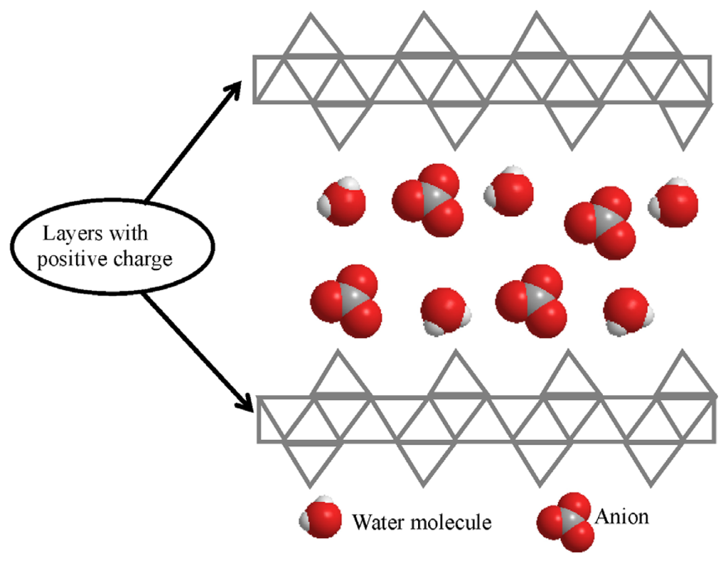 Layered hydroxides: layered hydroxide salts and layered double hydroxides are derived from a brucite layered structure, which is a naturally occurring magnesium hydroxide and was first discovered in 1824. The brucite structure is composed of a centering magnesium ion between six octahedrally arranged hydroxide ions. Each hydroxide ion is bonded to three magnesium atoms []. Layered double hydroxides can be represented by the general formula, [M2+1−xM3+x(OH)2]x+(An−)x/n·mH2O, where M2+ is a divalent cation, such as Mg2+, Zn2+, Ni2+, Mn2+, Co2+, etc., M3+ is a trivalent cation, such as Al3+, Fe3+, Cr3+, Co3+, etc., and An− denotes exchangeable organic or inorganic anions with charge (n−), such as NO3−, CO32−, Cl−, SO42−, OH−, which compensates the excess positive charge due to the isomorphical divalent/trivalent substitution in the interlayer region, while m represents the amount of water that is located in the interlayers (Figure 1) [].