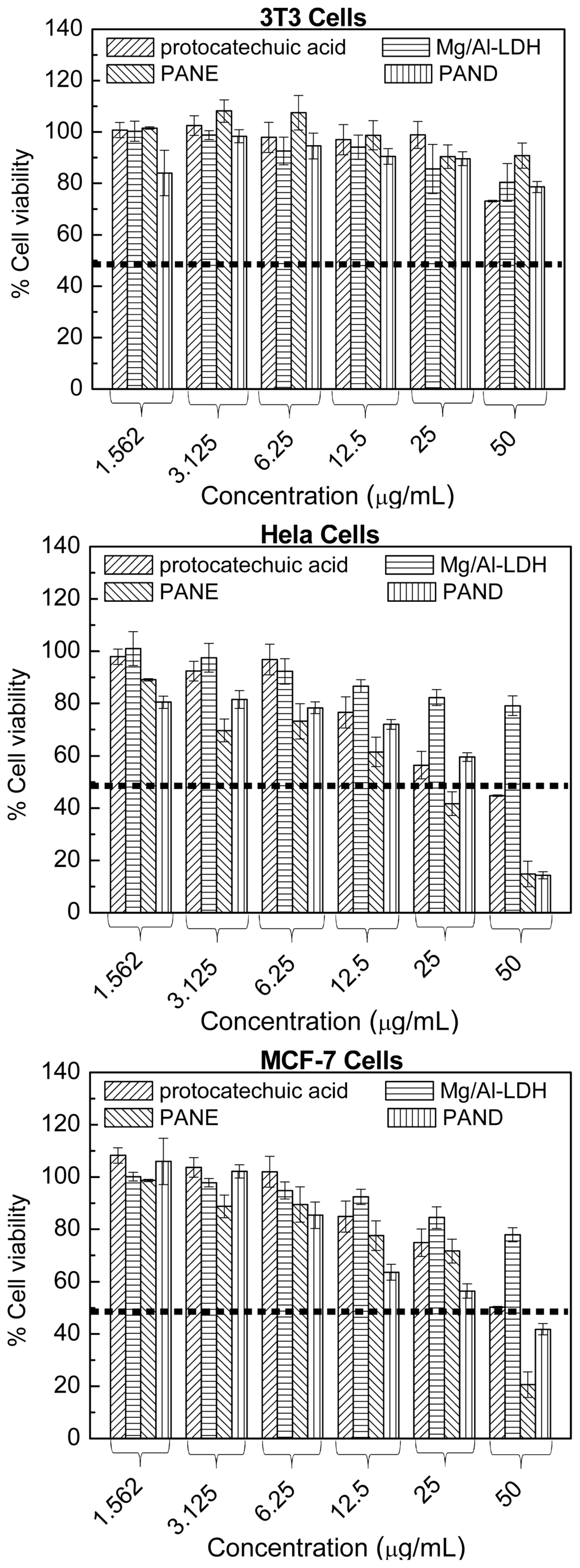 Protocatechuic acid (PA), an active anticancer drug, has been encapsulated in the Mg/Al-LDH interlayer by ion-exchange and direct coprecipitation methods. Protocatechuic acid has unique pharmacological properties, such as anticancer, antimutagenic, antioxidant, cardioprotective, anti-inflammatory, and chemopreventive properties []. As a result of the intercalation process, the thermal stability of the intercalated protocatechuic acid was significantly enhanced compared with free protocatechuic acid, and the protocatechuic acid anion was accommodated as a monolayer with an angle from the z-axis of 8° and 15° in PANE (protocatechuic acid-Mg/Al nanocomposite synthesized by ion-exchange method) and PAND (protocatechuic acid-Mg/Al nanocomposite synthesized by direct method), respectively. In addition, the release of protocatechuic acid from the nanocomposites at pH 7.4, 5.3, and 4.8 was much slower than its release from a physical mixture, which was fast and completed within 10 min. The release of PA from the PANE nanocomposite occurred within 1000, 3894, and 7500 min at pH 4.8, 5.3, and 7.4 in phosphate buffer solution, respectively, and from PAND nanocomposite was around 900, 1349, and 4000 min at pH 4.8, 5.3, and 7.4 phosphate buffer solution, respectively. Therefore, the release of protocatechuic acid from nanocomposites was sustained and makes them a promising candidate for controlled-drug release applications. Furthermore, release kinetic studies indicated that the pseudo-second order model (Table 2) could better describe the release kinetic processes of protocatechuic acid from PANE at pH 7.4 and 4.8, and from PAND at pH 7.4, while the kinetic release of protocatechuic acid from PAND and PANE in a pH 5.8 environment could be described by the parabolic diffusion model and pseudo-first order (Table 2), respectively. On the other hand PAND at pH 4.8 obeyed pseudo-first order kinetic release [].