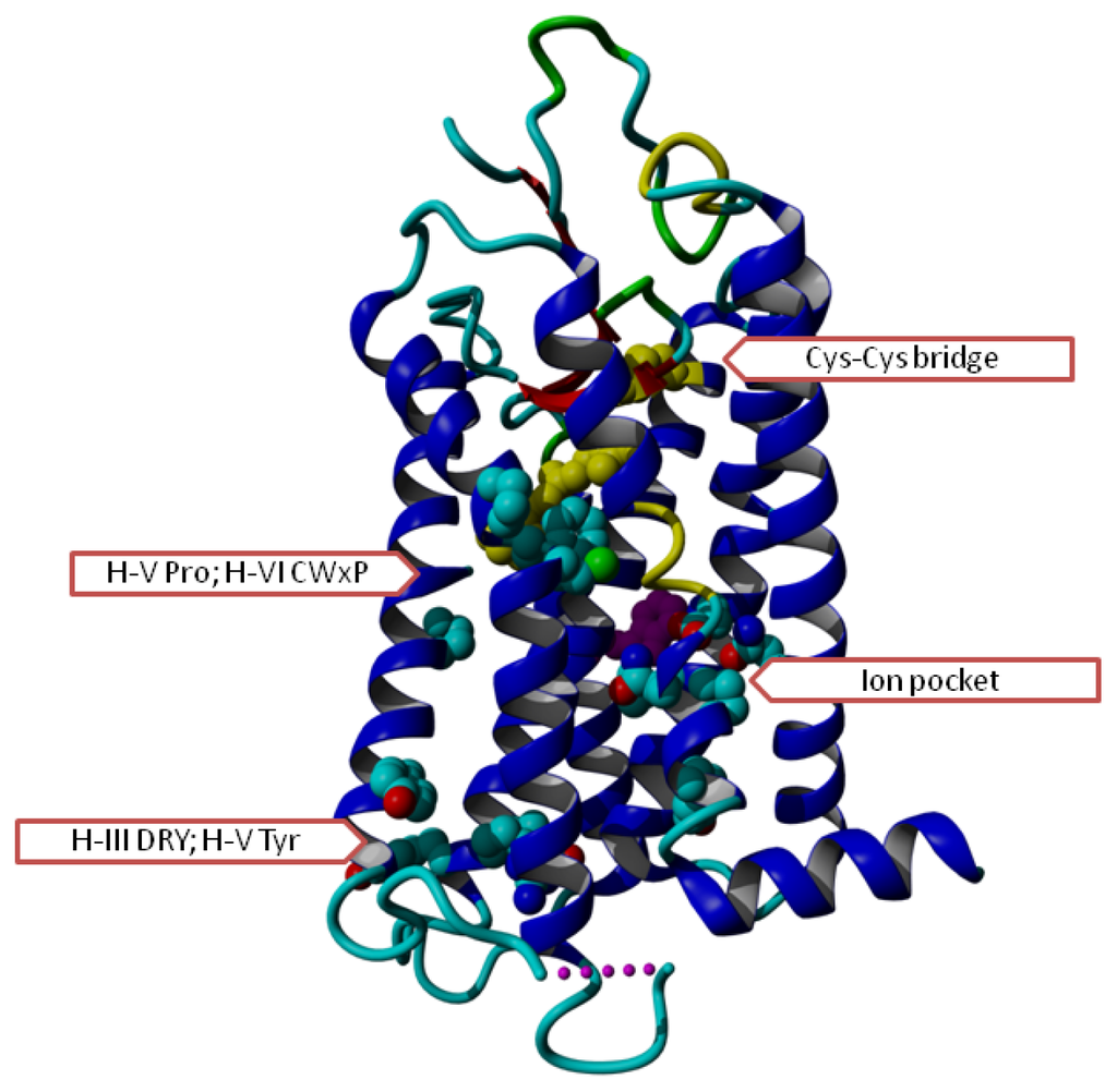 GPCRs possess seven transmembrane helices that traverse the membrane as illustrated in Figure 1. The N-terminus is located extracellularly and the C-terminus is located in the cytosol. Each helix contains at least one highly conserved residue (see Figure 1). These conserved residues are commonly used to anchor GPCR sequence alignments using the soon to be abandoned concept that “there are no insertions and deletions in helices” [5,6].
