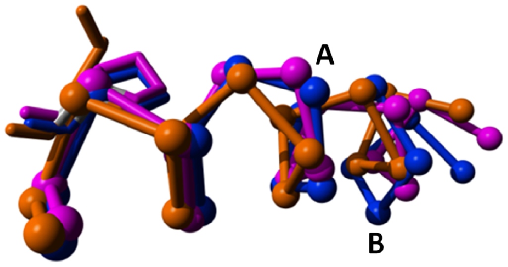 The area around the bulge in helix-V. The S1P lipid receptor (orange, PDBid = 3v2y [45]) does not have α-bulges in helix V and is given as a reference. Rhodopsin (magenta, PDBid = 1f88 [2]) and the adenosine-2A receptor (blue, PDBid = 3eml [46]) have an α-bulge (A) between positions 516 and 517; and the adenosine-2A receptor has an extra bulge (B) between positions 511 and 512. Side chains of residues at position 520 are shown. Rhodopsin and the adenosine-2A receptor have a proline at position 520. The S1P lipid receptor, which does not have bulges in helix V, does not have a proline at position 520. Time will tell if this correlation is accidental or causal.