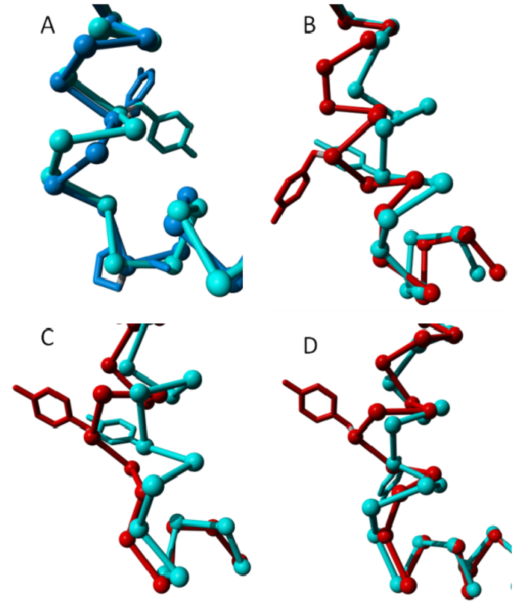 Bulges in helix IV. Left: CXCR4 chemokine receptor (blue; PDBid = 3odu [48]) superposed on the delta opioid receptor (cyan; PDBid = 4ej4 [51]) as reference. The CXCR4 chemokine receptor has an α-bulge between positions 418 and 419; and Right: M2 muscarinic acetylcholine receptor (red; PDBid = 3uon [49]) superposed on the dopamine D3 receptor (cyan; PDBid = 3pbl [52]) as a reference. The M2 muscarinic receptor has an α-bulge between positions 428 and 429.