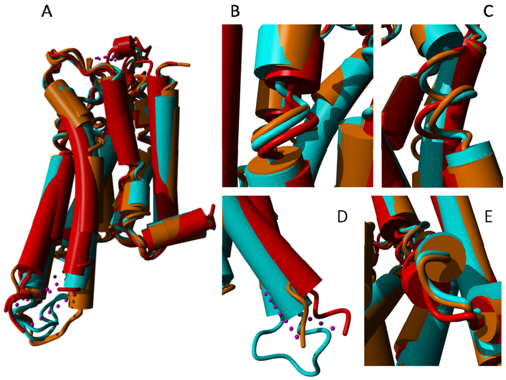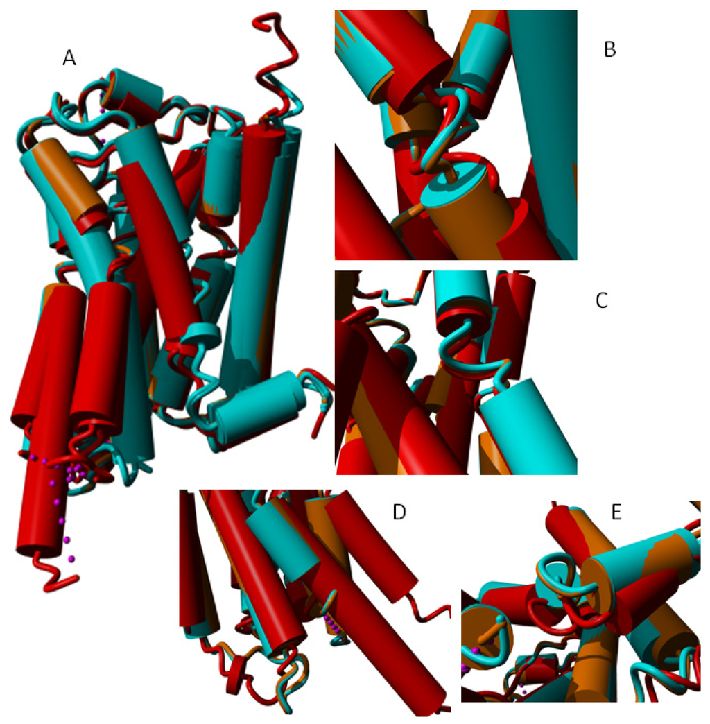 Figure 13 shows differences in the helices observed in globally superposed structures. Figure 13 shows the same helices in the same colors with the helices superposed locally. This local superposition reveals that helix VI rotates as a whole rather than its cytosolic side bending outwards (see Figure 14). Helix III becomes more regular and less bent upon binding an agonist. Helix V winds up more tightly going from the inverse agonist, via the antagonist, to the agonist bound structures.