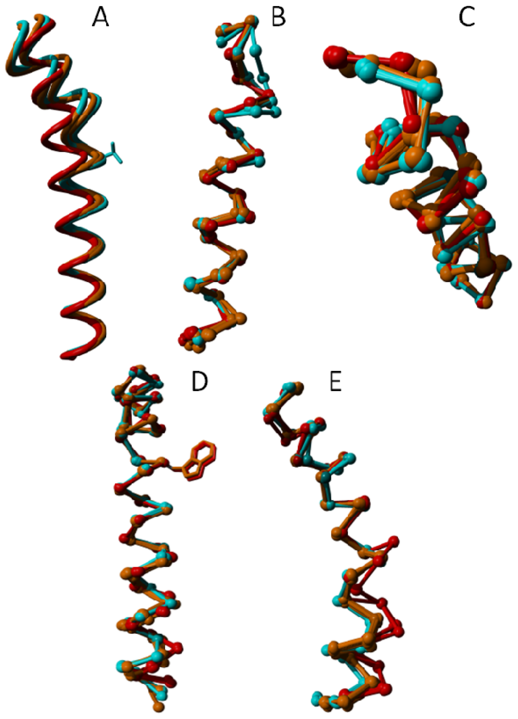 Local superposition results of A2A adenosine receptor transmembrane helices. In this figure, helices are taken out of the structure and superposed without using the rest of the molecule. (A) Helix III becomes more regular upon activation. The side chain of one of Val-322 (known in many GPCRs to be crucial for binding the endogenous ligand) is indicated as a point of reference; (B) Helix IV is highly irregular at the cytosolic side. It is not clear if this is caused by the bound ligand or if it is caused by a crystal packing artifact; (C) Helix V is seen winding up more tightly going from inverse agonist, via antagonist, to agonist bound structures; (D) Helix VI neither tilts nor kinks upon activation. Instead, the entire helix rotates. A minor tightening of the cytosolic end of the helix is observed in the agonist bound form; and (E) Helix VII forms a bulge on the intracellular side upon activation while rotating toward the centre of the seven-helix bundle. 3qak shows a different Cα trace, which correlates with the absence of a structural water near this difference.