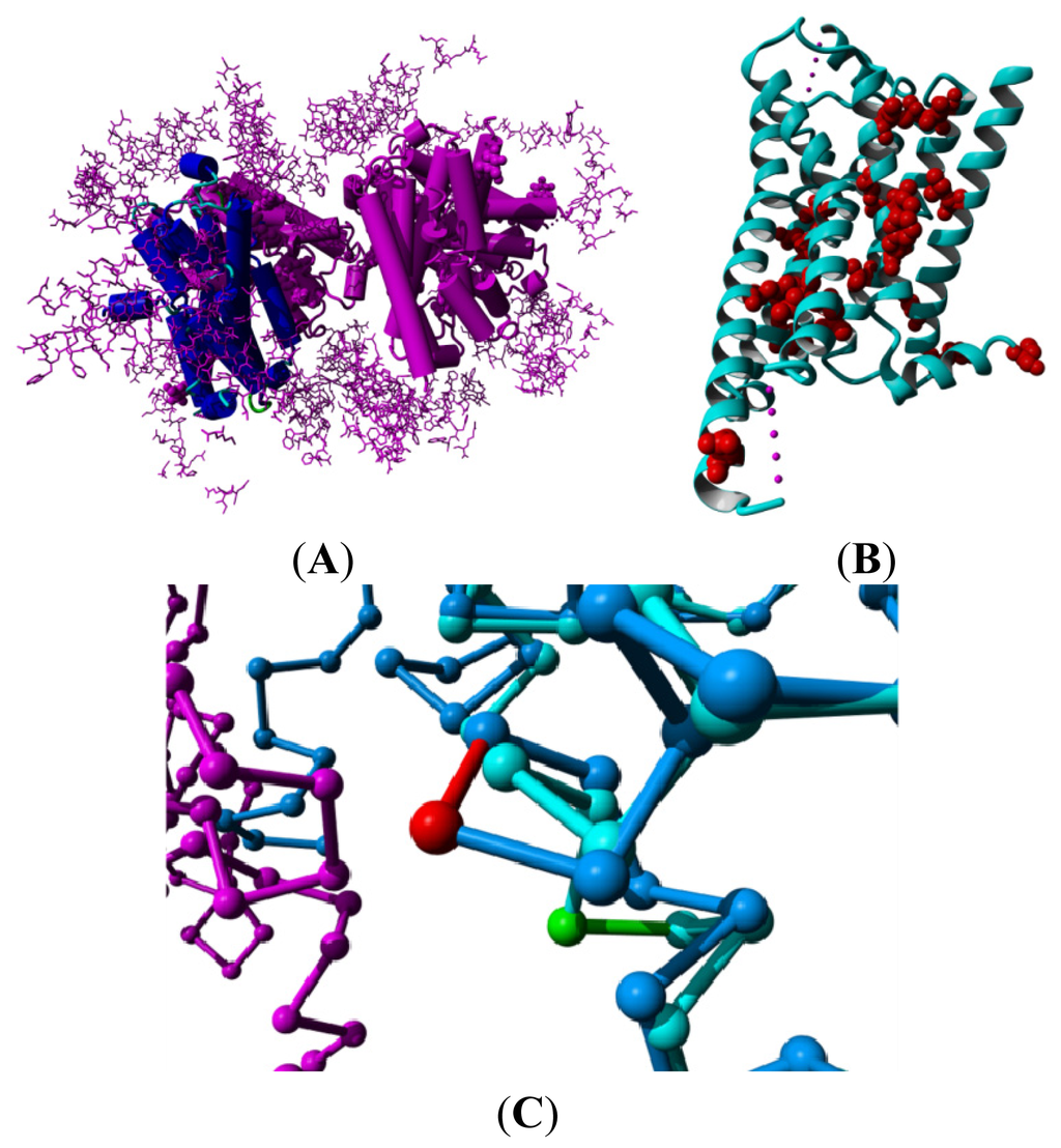 Figure 12 shows the bulges in helix IV in the CXCR4 chemokine receptor (PDBid = 3odu [48]) and the M2 muscarinic acetylcholine receptor (PDBid = 3uon [49]). At present, it is not possible to evidentially associate these bulges with any particular function, although it could be speculated that they play a role in dimer formation.