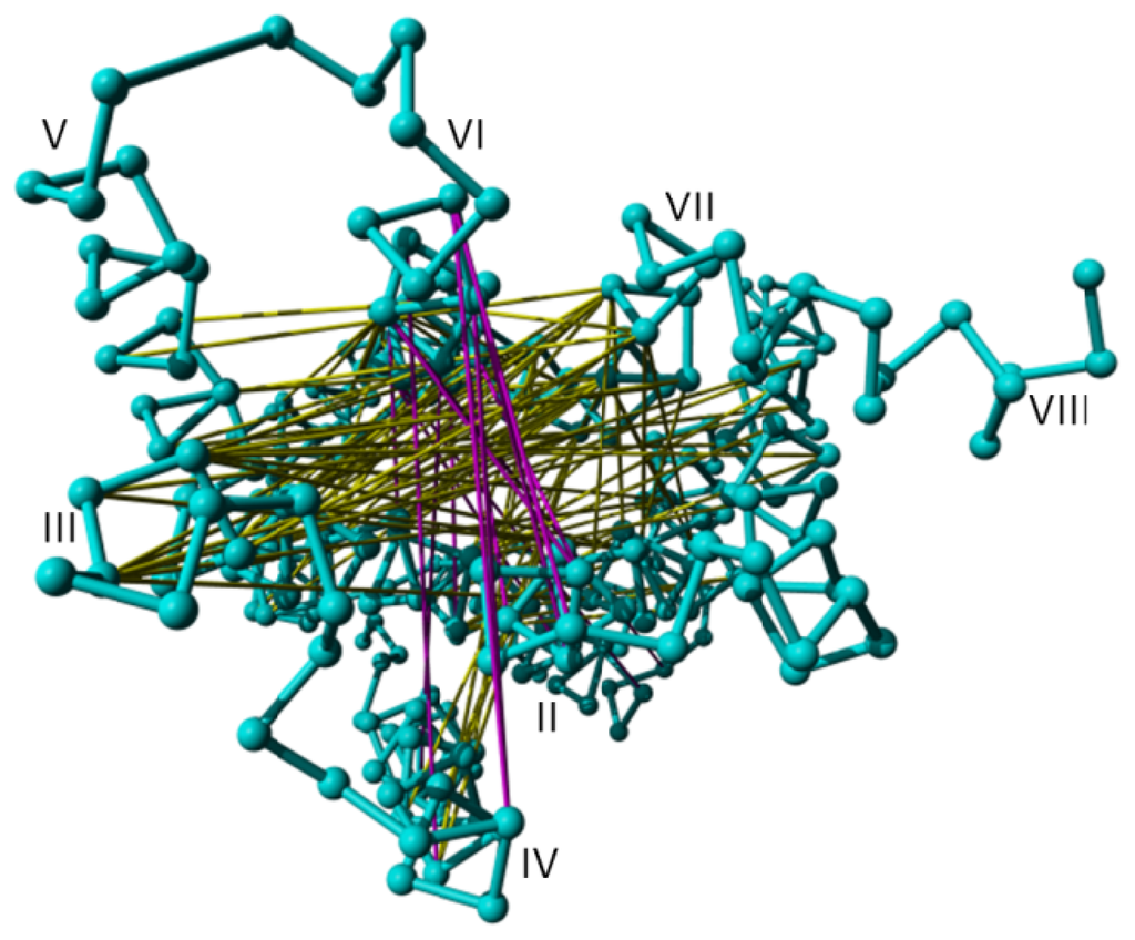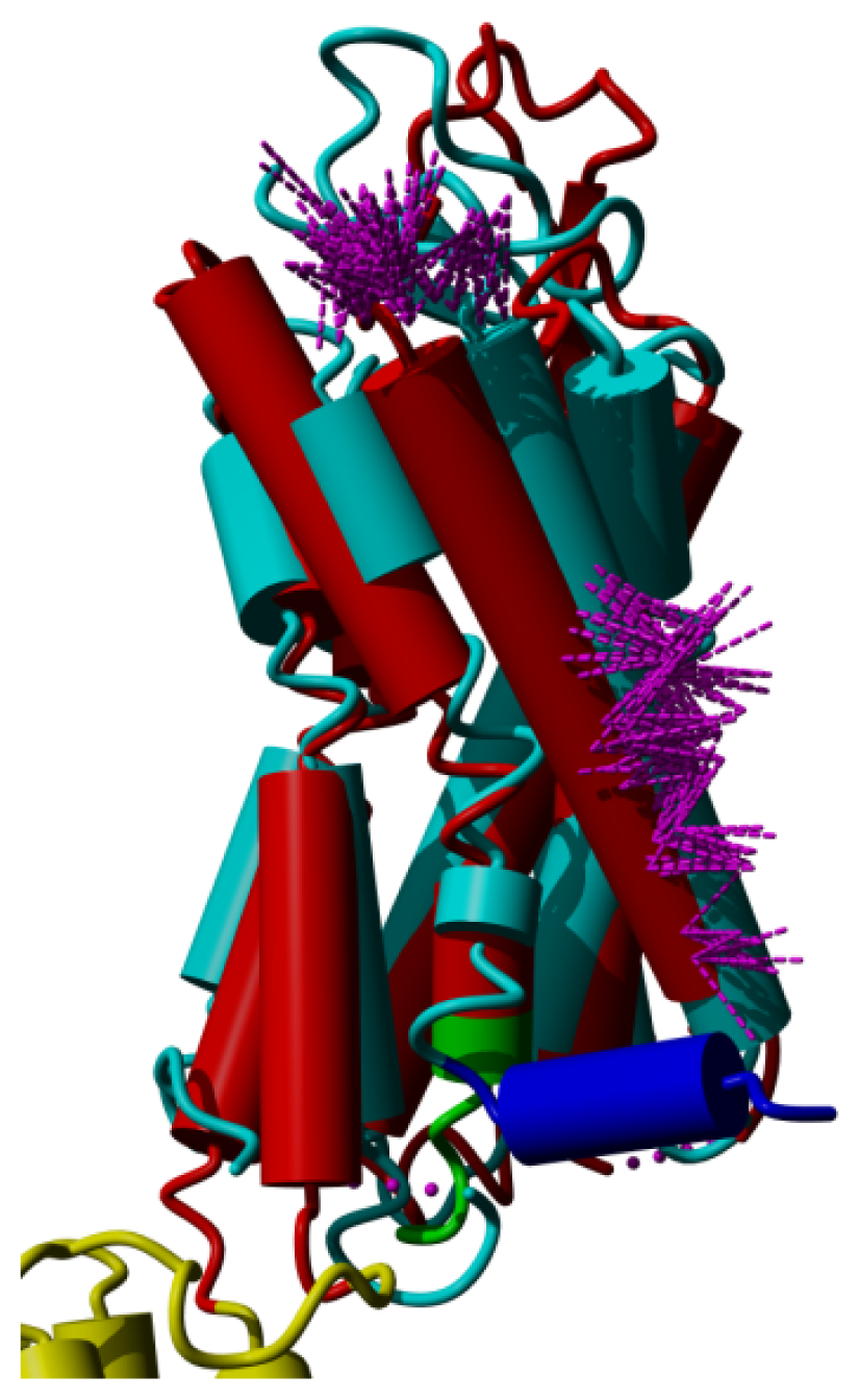 Visual inspection reveals that residue Tyr733 is displaced the most between active and inactive structures, with widening of the gap between helices III and VI also being closely associated with activation. In total, 202 distance vectors relate to displacement of the Tyr733 residue. However, almost eight times this number of vectors contribute to the relative displacement of helices III and VI. This asymmetry between the number of distance vectors related to displacement of Tyr733 and the number of distance vectors related to displacement of helices III and VI causes artifacts in the RF computations [32,33]. We therefore iteratively searched for the pair of distance vectors that had the highest Pearson correlation coefficient, randomly removing one of the two vectors during each iteration. This process was repeated until no two distance vectors had a Pearson correlation coefficient higher than 0.90, resulting in removal of around 80% of the vectors. The RF determination of the distance vectors most representative for the differences between active and inactive structures are projected on 1F88 in Figure 6. The yellow lines in Figure 6 represent distances that are shorter in the active state GPCRs than in the inactive ones. Most of the yellow vectors in Figure 6 are caused by a small but systematic displacement of helix III towards the extracellular side in the active state structures. The magenta lines represent distances that increase upon activation. These mainly involve the cytosolic side of helix VI, which undergoes an outward motion away from the rest of the helix bundle upon activation.