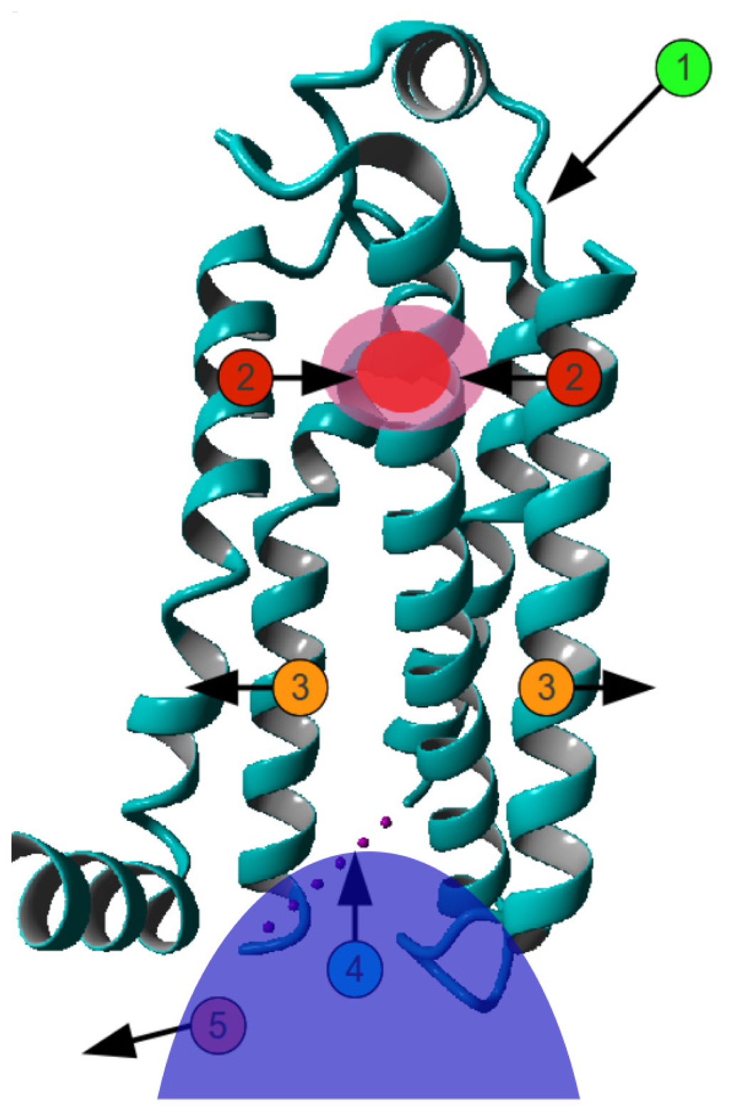 Mechanism of GPCR activation. Agonist binding (1) induces inward motions (2) of the extracellular side of helices V–VII. This is accompanied by an outward movement of the cytosolic side of helices V–VII (3), allowing the G protein (shown as solid blue blob) to bind (4) and become activated (5). Obviously, there is no fixed order in the motions. The determination of what moves where depends largely on the superposition method used.