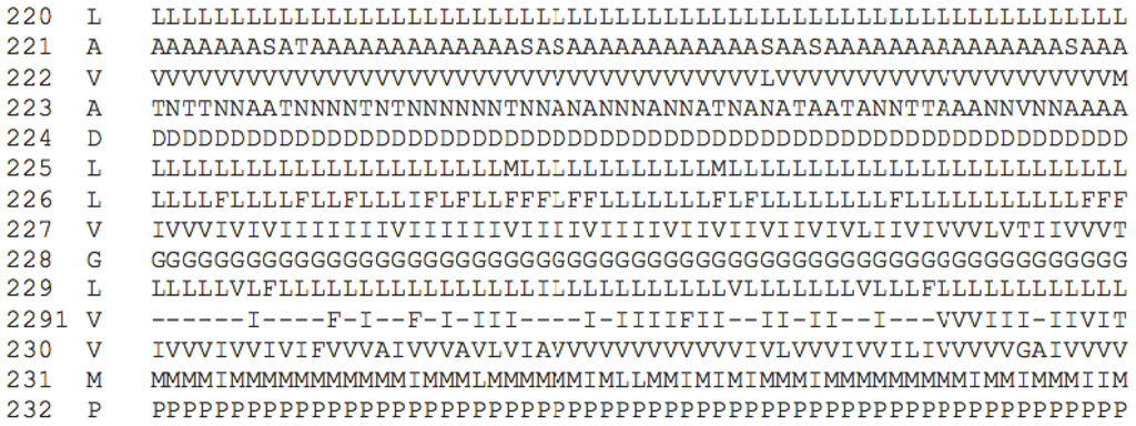 Fourteen consecutive residues in helix II (starting at the conserved L at position 220) extracted from the trace amine sequence alignment from the GPCRDB. From left to right the columns contain the GPCRDB sequence number, the consensus sequence at that position, and the amino acid at that position in each of the 61 sequences in the GPCRDB trace amine family 16. Figure copied with permission from Isberg et al. [31].