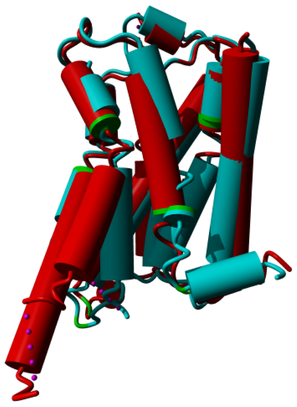 β-2 adrenoceptor in the active state (PDBid = 3sn6 [11]; red) superposed on the inactive state (PDBid = 3ny8 [12]; cyan). The superposition was performed with the WHAT IF superposition module and involved 239 residues that matched with an RMS Cα displacement of 1.34 Å. Ligands, sugars, G proteins, etc. are not shown for clarity. Prolines are colored green. The major differences observed are in helices V and VI in the lower left of the figure. In the active form, helix V is much longer and the cytosolic half of helix VI is rotated outwards by about 30 degrees (please note that this involves a rotation of the entire helix, not just the cytosolic half). Further large differences are seen in helix VII (in the centre) and in the corner between helices VII and VIII. The different orientation of helix I (right most helix) in the two structures is most likely caused by crystal packing artifacts.