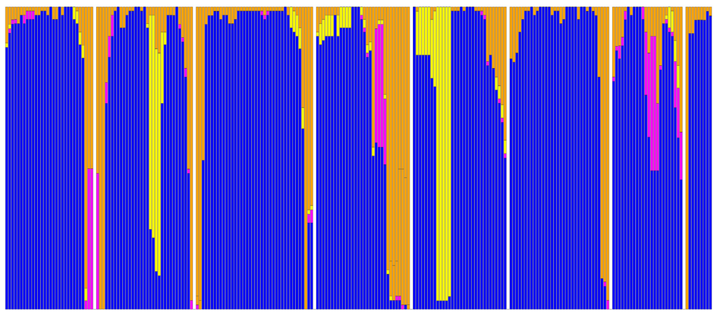 Secondary structure distribution for residues that are common to the 69 structures used in this study. Blue: α-helix; yellow: α-bulge/π-helix; purple: 310 helix; orange: loop, strand, and turn. Each vertical bar is 69 residues high and the fraction of the bar in a certain color corresponds to the fraction of residues with the corresponding secondary structure. Secondary structures were determined with DSSP 2.0. The plot contains all transmembrane residues plus a few residues into the loop areas that all 69 structures have in common. In most α-bulge areas, one residue is therefore not counted. Small white bars represent the elements between the transmembrane regions that are not structurally conserved throughout the 69 structures. The central part of helix VII is either a regular helix, or consists of a stretch of 310 helix combined with a bulge or similar irregularity. Despite bulges and 310 stretches, the part of helix VII that ends with the conserved NP motif at positions 729 and 730 always has equally many residues so that no residue numbering differences can be observed between receptors.