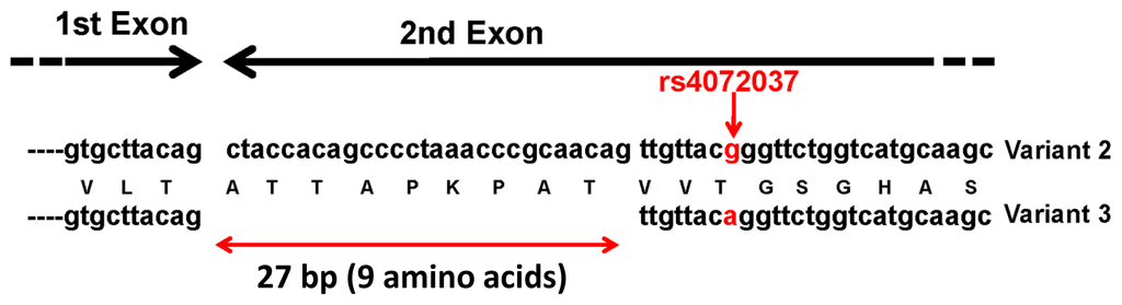 In the other DGC susceptibility locus 1q22, the haplotype block contained five genes, in which we identified the mucin 1 gene (MUC1) as the susceptibility gene [9]. A representative SNP in MUC1, rs2070803, showed the association with DGC (p = 2.20 × 10−6, adjusted per allele OR = 1.63, 606 cases and 1264 controls), which was replicated in additional Japanese (p = 3.93 × 10−5, OR = 1.81, 304 cases and 1465 controls) and Korean (p = 2.19 × 10−4, OR = 1.82, 452 cases and 372 controls) case-control panels. Moreover, we identified a functional SNP rs4072037 (A/G) in the MUC1 gene, and the A allele was associated with DGC patients [9]. The SNP influences the splicing of the primary transcripts. We revealed that there are two major MUC1 transcripts in the gastric epithelium: variants 2 and 3. The rs4072037 located in the 5′ side of the second exon determines the splicing acceptor site in the second exon, which in turn determines the type of variants; the G and A alleles result in the expression of variants 2 and 3, respectively (Figure 1) [9,29]. The structural difference between the two variants is nine amino acids in the second exon that are involved in the N-terminal signal peptide. This difference in the signal peptide may lead to a difference in the function of the encoded protein between the two splicing variants.