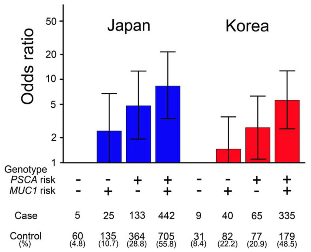 Japanese and Korean populations can be stratified based on PSCA and MUC1 genotypes associated with risk for DGC. The stratification and risk estimation were performed using genotype data of rs2294008 in PSCA and rs4072037 in MUC1 [9]. The risk allele’s effect is assumed to be dominant for rs2294008 in PSCA (risk genotype: TT and TC; protective genotype: CC) and recessive for rs4072037 in MUC1 (risk genotype: AA; protective genotype: GG and GA). Bar, upper and lower bounds of 95% confidence interval.
