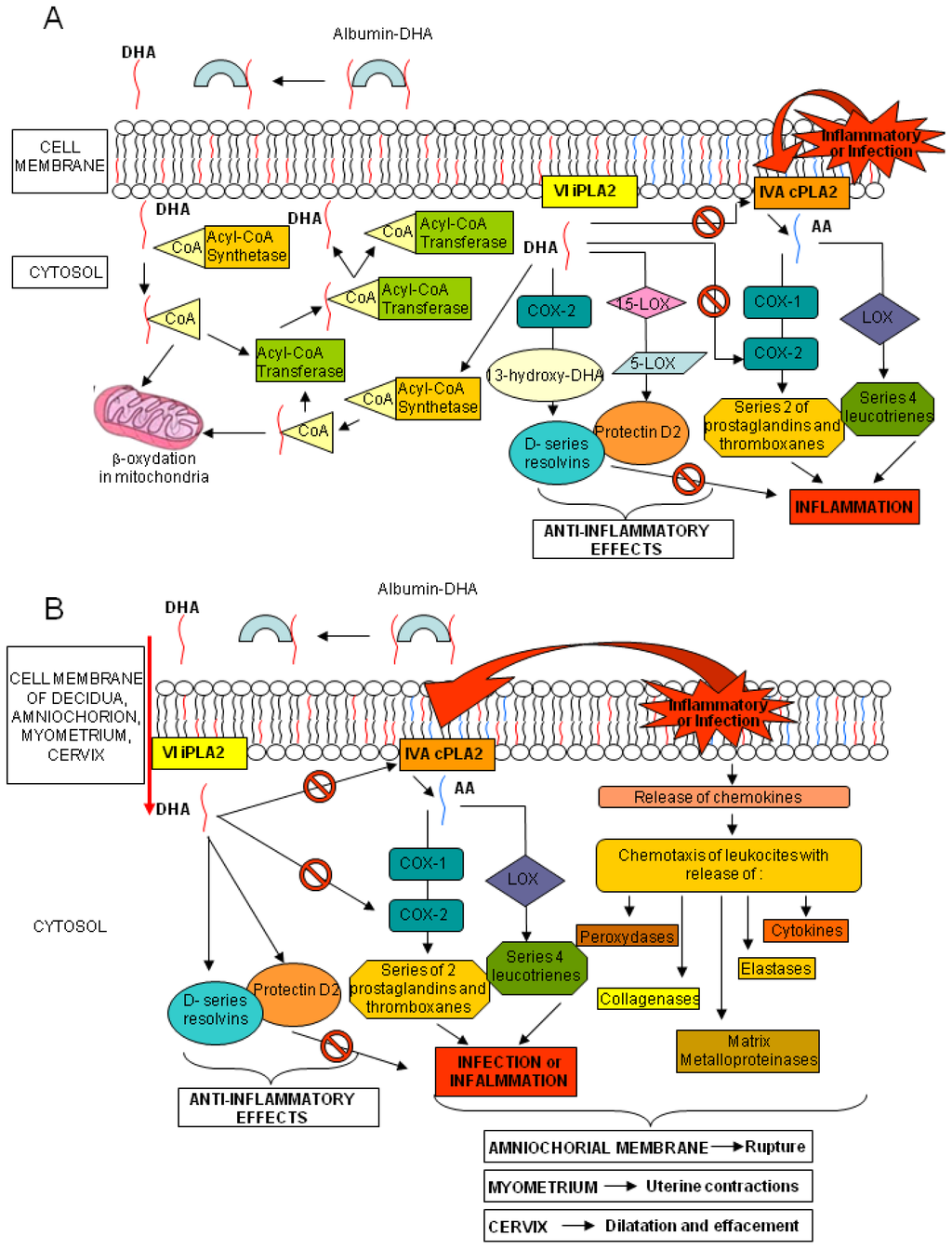 The evidence that labor and rupture of the amniochorial membranes at term, might be caused by the action of cytokines, eicosanoids and enzymes, released by the chorion-decidua, cervix and myometrium [], prompted us to consider the possible preventive role of DHA in the process of rupture of membrane (ROM) before labor. Both infection and inflammation cascades, through the production of chemokines, recruit leukocytes, releasing peroxidases, elastases, collagenases and matrix metalloproteinases. The same phenomena activate cPLA2, starting the AA metabolism with the synthesis of prostaglandins and thromboxanes (series-2) and leukotrienes (series-4). All these mediators have a role in different tissues: in the myometrium they induce uterine contractions, in the cervix they cause effacement and dilation, while in amniochorial membranes, through the degradation of collagen fibers, they may decrease physical resistance causing the rupture. The same mechanisms may could also lead to events such as preterm labor and ROM at any gestational age. The effects of DHA and the anti-inflammatory properties of its mediators could modify the micro-environment of the chorion-decidua, cervix and myometrium, reducing the incidence of these events (Figure 1, panel B).