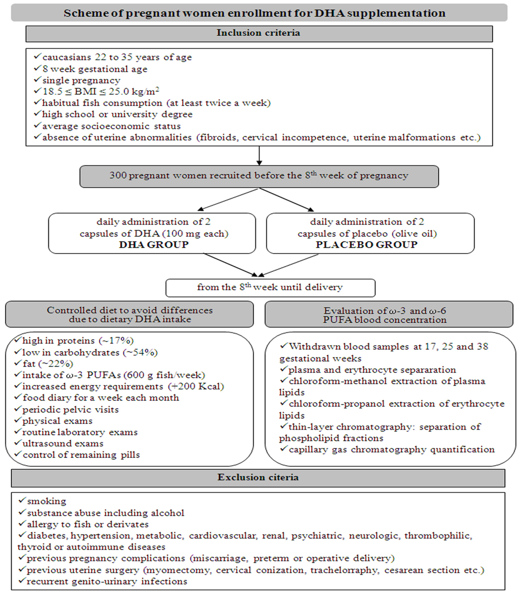 Three hundred pregnant women were recruited at the Department of Obstetrics and Gynaecology, San Camillo Forlanini Hospital, Rome, Italy, before the 8th week of pregnancy. In Figure 2 the inclusion/exclusion criteria are reported. We administered DHA, rather than a ω-3 FA supplemented cocktail, to pregnant women who met the criteria (Figure 2, Table 1). The DHA supplementation consisted in 2 capsules of DHA (100 mg each) administered daily (DHA group), vs. 2 capsules of placebo (olive oil) to be taken each day (control group), until delivery. In order to avoid differences due to dietary DHA, the women’s diet was checked in composition and energy content requirements. Every woman was invited to fill a food diary each month and to undergo a clinical evaluation and laboratory exams. To evaluate ω-3 and ω-6 PUFA blood concentration, women were submitted at 17, 25, and 38 weeks to specific blood tests, including plasma and erythrocyte fraction separation, and lipid quantification of both fractions by capillary gas chromatography (GC) techniques (Figure 2).