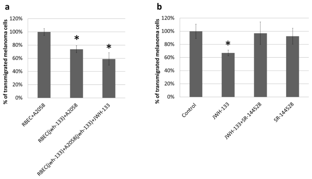 2.3. Effect of CB2 Activation on the Transmigration of Melanoma Cells through Brain Endothelial Cell Layers