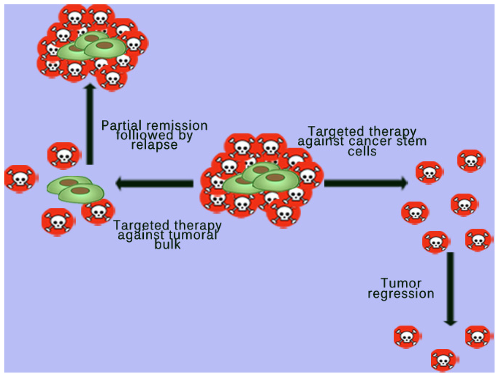 Targeted therapy against cancer stem cells. Therapeutics aimed at the general population of cancer cells has a limited impact on cancer stem cells (CSCs). In time, their regenerative and proliferative capabilities are responsible for the relapse. On the contrary, therapy aimed at the CSC population determines a destruction of the population responsible for differentiation and proliferation which in turn produces a much more pronounced and stable tumoral regression. The CSCs are displayed as the green, larger cells while the non-stem cells are depicted as the smaller, red with the skull and bones in the middle.