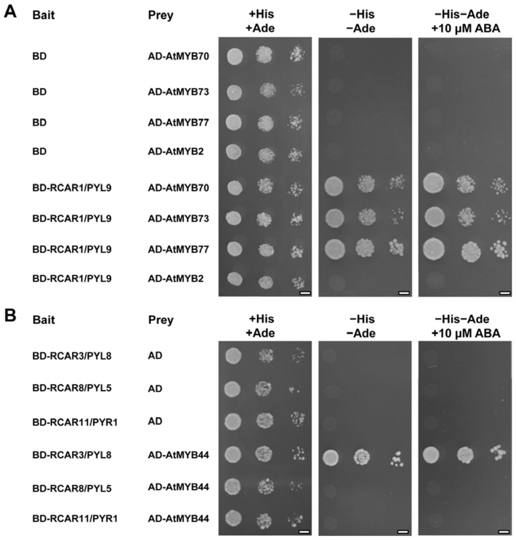 Interactions between RCARs/PYR1/PYLs and the other members of 22nd subgroup of R2R3-MYBs. (A) Yeast two-hybrid assay was performed using RCAR1/PYL9 as bait and the full-length AtMYB70, AtMYB73, and AtMYB77 and AtMYB2 as preys. The empty BD and prey vectors were used as negative controls. Picture of the plates were taken after 3 days at 30 °C; and (B) Yeast two-hybrid assay was performed using the full-length RCAR3/PYL8, RCAR8/PYL5 and RCAR11/PYR1 as baits and AtMYB44 as prey. The empty AD and bait vectors were used as negative controls. Pictures of the plates were taken after 3 days at 30 °C. Scale bars = 2.5 mm.