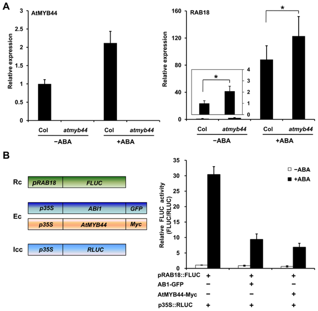 AtMYB44 negatively regulates the expression of ABA-responsive gene RAB18. (A) Relative expression levels of AtMYB44 and RAB18 in wild-type (Col) and atmyb44 mutant plants were determined by qRT-PCR analysis. 2-week-old seedlings were incubated in 1 × MS liquid medium with ABA (10 μM) or control solvent (DMSO) for 2 h before harvest. ACTIN2/8 served as an internal control. Error bars indicate SD (n = 3). Three independent replicates were analyzed. Asterisks indicate the levels of statistical significance as determined by Student’s t-test: * p < 0.05 vs. Col; and (B) The effect of AtMYB44 on ABA-responsive RAB18 gene expression was analyzed by transactivation assay in Arabidopsis protoplasts. Left panel: Schematic representation of reporter, effector and internal control constructs used in transactivation assays. Rc indicates Reporter construct; Ec indicates Effector constructs; Icc indicates Internal control construct; Right panel: AtMYB44 negatively regulates RAB18 expression in protoplasts. pRAB18::FLUC, p35S::ABI1-GFP, and p35S::AtMYB44-Myc plasmids were co-transfected into Arabidopsis protoplasts from the wild-type plants as the indicated combinations. RLUC was used as an internal control. After transfection, protoplasts were incubated for 5 h under light in the absence (open bars) or presence (filled bars) of 5 μM ABA, and luciferase activity was measured. Values are mean ± SD of three independent experiments.