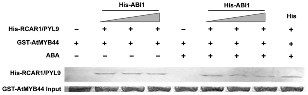 To understand how AtMYB44 negatively regulates the expression of ABA-responsive genes, we further focused on the interaction between AtMYB44 and RCAR1/PYL9. Previous reports showed that competition might occur when two proteins interacted with the same protein. For example, the interaction between DELLAs and JAZs affects the binding of MYC2 to JAZs [23], and the interaction between SOS3 and SOS2 affects the binding of ABI2 to SOS2 [24]. Since RCAR1/PYL9 protein functions as an ABA receptor through interacting with PP2Cs and inhibiting their phosphatase activities in the presence of ABA [5,6], the interaction between RCAR1/PYL9 and PP2Cs may affect the binding between RCAR1/PYL9 and AtMYB44. To test this possibility, we performed competitive GST pull-down assays. Recombinant GST or GST-AtMYB44 was used to pull down His-RCAR1/PYL9 in the absence or presence of His-ABI1 (one member of PP2Cs). In the presence of ABA, the interaction between His-RCAR1/PYL9 and GST-AtMYB44 was significantly impaired by an increased amount of His-ABI1 (Figure 4). In another assay, His protein was used as a control instead of His-ABI1. As is shown in Figure 4, His protein did not affect the binding of His-RCAR1/PYL9 and GST-AtMYB44. These results reveal that AtMYB44 and ABI1 compete in vitro for binding to RCAR1/PYL9 in the presence of ABA. To test whether other proteins that interact with RCAR1/PYL9 also compete with ABI1 for the binding to RCAR1/PYL9 in the presence of ABA, ArathEULS3 (one protein listed in Table S1) was representatively chosen for research. However, no significant competition between ABI1 and ArathEULS3 was found in our competitive pull down assay (data not shown), suggesting that not all proteins that interact with RCAR1/PYL9 can compete with ABI1 for the binding to RCAR1/PYL9.
