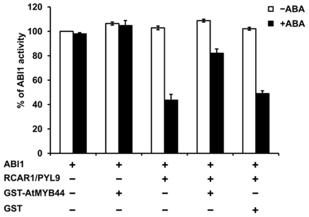 In summary, we demonstrate that an R2R3-type MYB transcription factor, AtMYB44, interacts with the ABA receptor RCAR1/PYL9 and likely reduces its inhibitory effect on ABI1 activity in vitro and in vivo. These results may explain how AtMYB44 participates in ABA signaling.