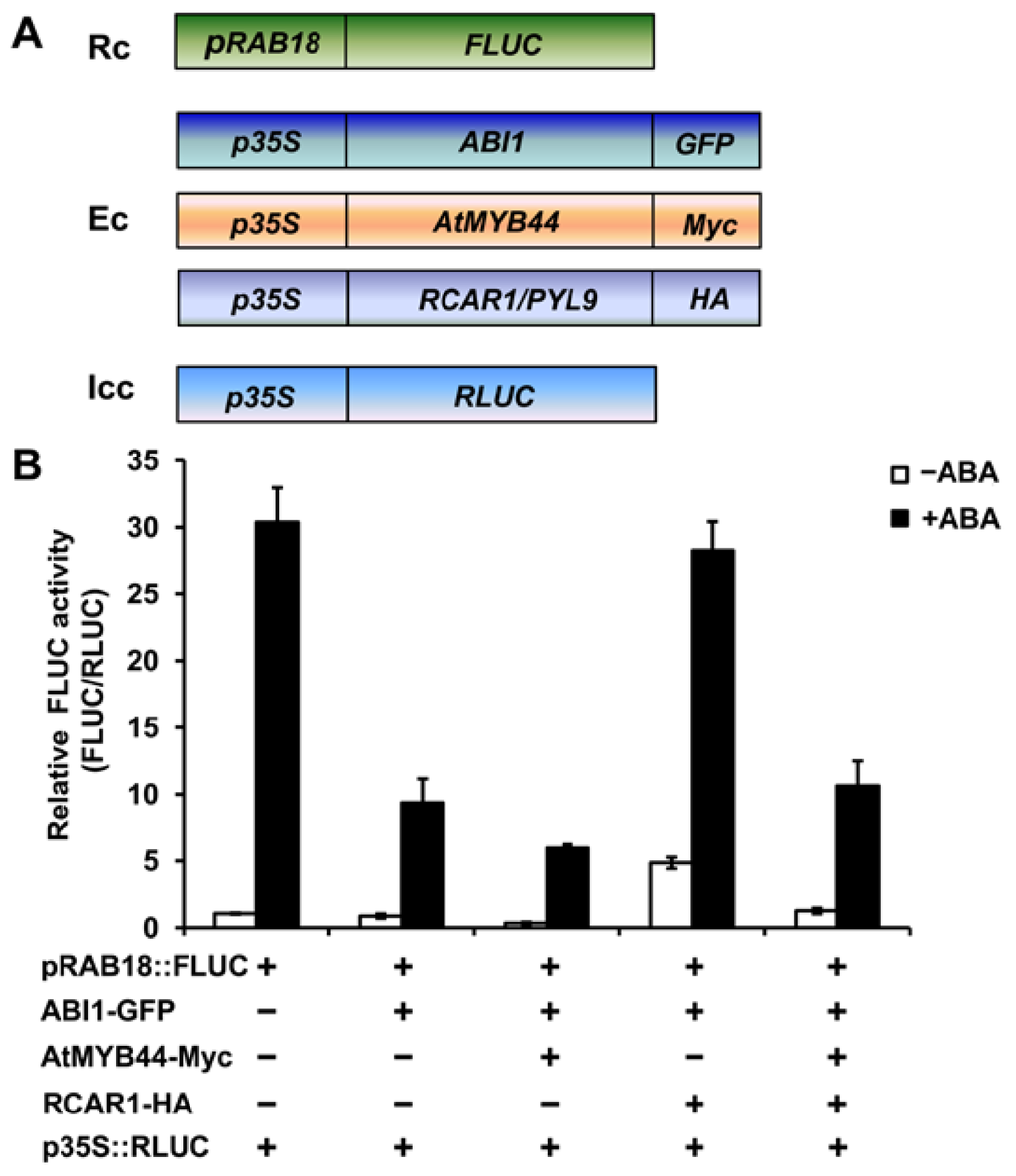 Preparation of Arabidopsis protoplasts and subsequent transfection of protoplasts were performed as described above. The vector pRAB18::FLUC was used at 2.5 μg per transfection, p35S::AtMYB44-Myc, p35S::RCAR1/PYL9-HA and p35S::ABI1-GFP were used at 2 μg per transfection, and p35S::RLUC was used at 0.5 μg per transfection. When indicated, 5 μM ABA was added into the incubation buffer. Luciferase activity was measured by an LMax II384 luminometer (Molecular Devices, Bad Wildbad, Germany) using the Dual-Luciferase Reporter Assay System from Promega (Madison, WI, USA). Relative FLUC activity was calculated by normalizing against the RLUC activity, and the data presented were the averages of three biological replicates.