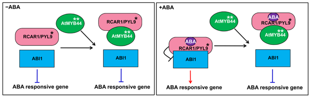 A hypothetical model for the action mechanism of AtMYB44 in ABA signaling. In the absence of ABA, AtMYB44 interacts with RCAR1/PYL9, but does not affect ABI1 activity. Upon ABA perception, AtMYB44 competes with ABI1 for binding to RCAR1/PYL9, releasing the inhibitory of RCAR1/PYL9 on ABI1 activity and thus down-regulating the expression of ABA-responsive genes. “*” indicates that this component may also include RCAR2/PYL7, RCAR3/PYL8 and RCAR4/PYL10. “**” indicates that this component may also include AtMYB70, AtMYB73 and AtMYB77.
