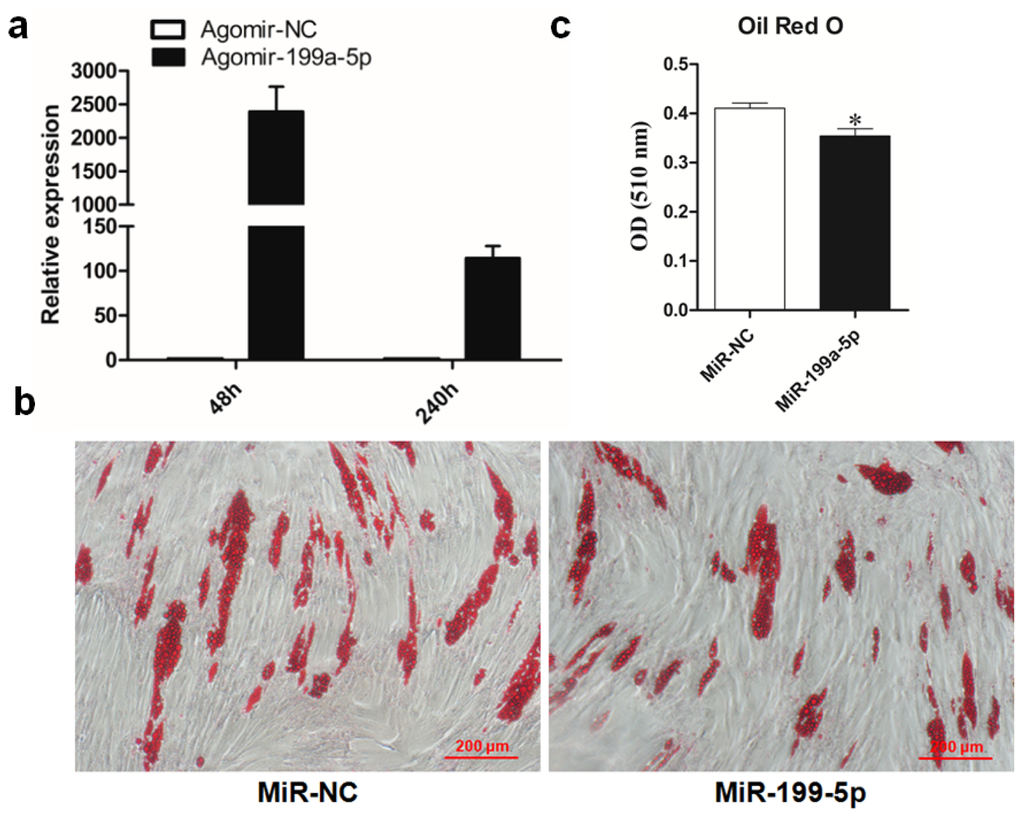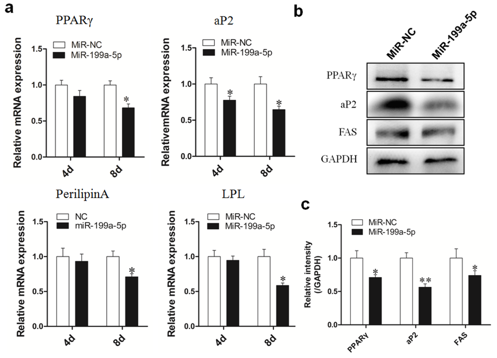 2.1.3. Overexpression of miR-199a-5p Attenuated the Lipid Accumulation and Adipogenic Marker Genes Expression in Porcine Adipocytes
