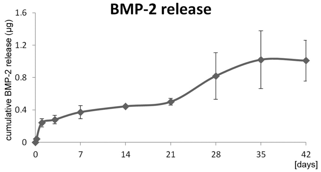In vitro elution studies showed a sustained release of the incorporated BMP-2. The weak burst release within the first day was followed by a sustained release of approximately 1 μg BMP-2 in total until Day 42 (Figure 1).