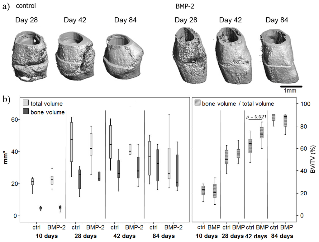 The 3D reconstruction of specimens exemplary chosen showed an increasing callus mineralization over time in both control and BMP-2 treated groups (Figure 2a). At Day 84 the callus volume decreased in both groups, but slightly more in the BMP-2 treated animals.