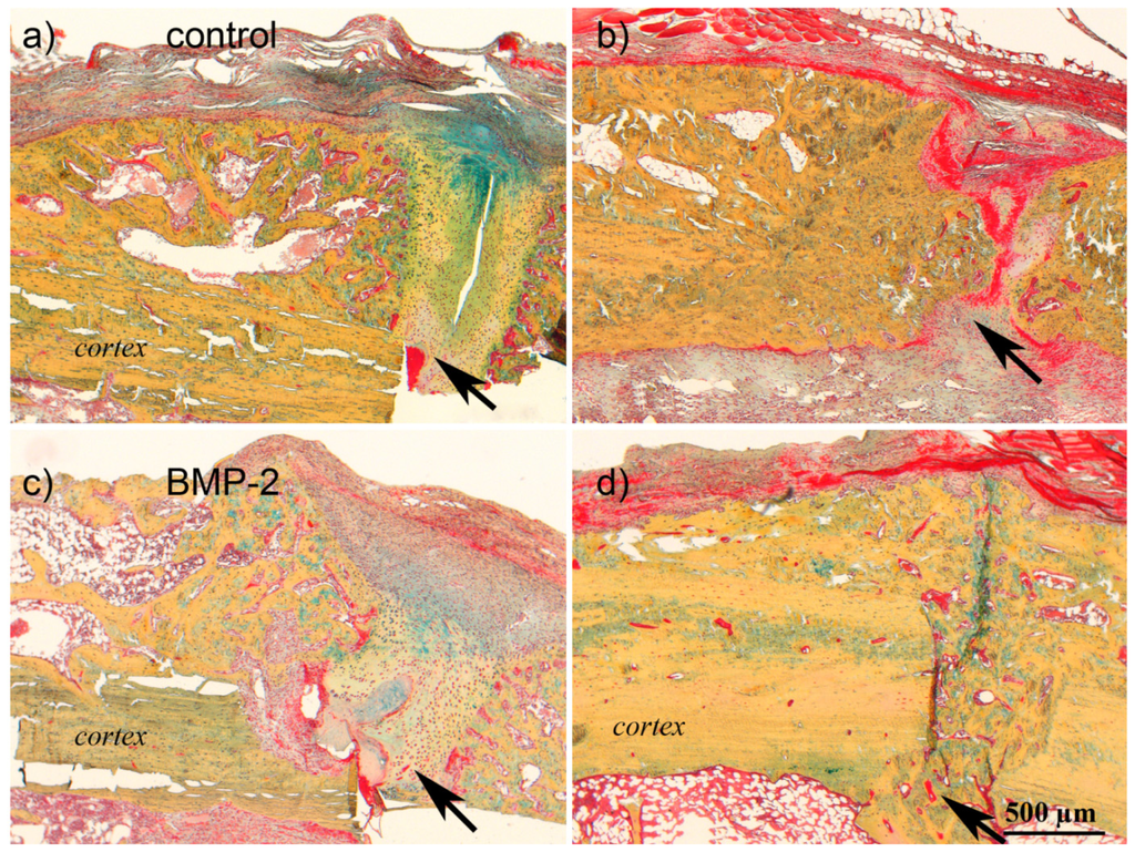Histological staining of the calluses of the control and the BMP-2 group at Days 28 and 84. Movat pentachrome stainings of the two groups (control group: a,b; and BMP-2 group: c,d) at Days 28 (a,c) and 84 (b,d). The arrows point to the osteotomy gap. At Day 28, the calluses of both groups showed no fully mineralized bridging, as fibrous tissue was still filling the gap above the osteotomy. After 84 days, the healing progressed with fully mineralized callus in the BMP-2 group. Scale bar: 500 μm.