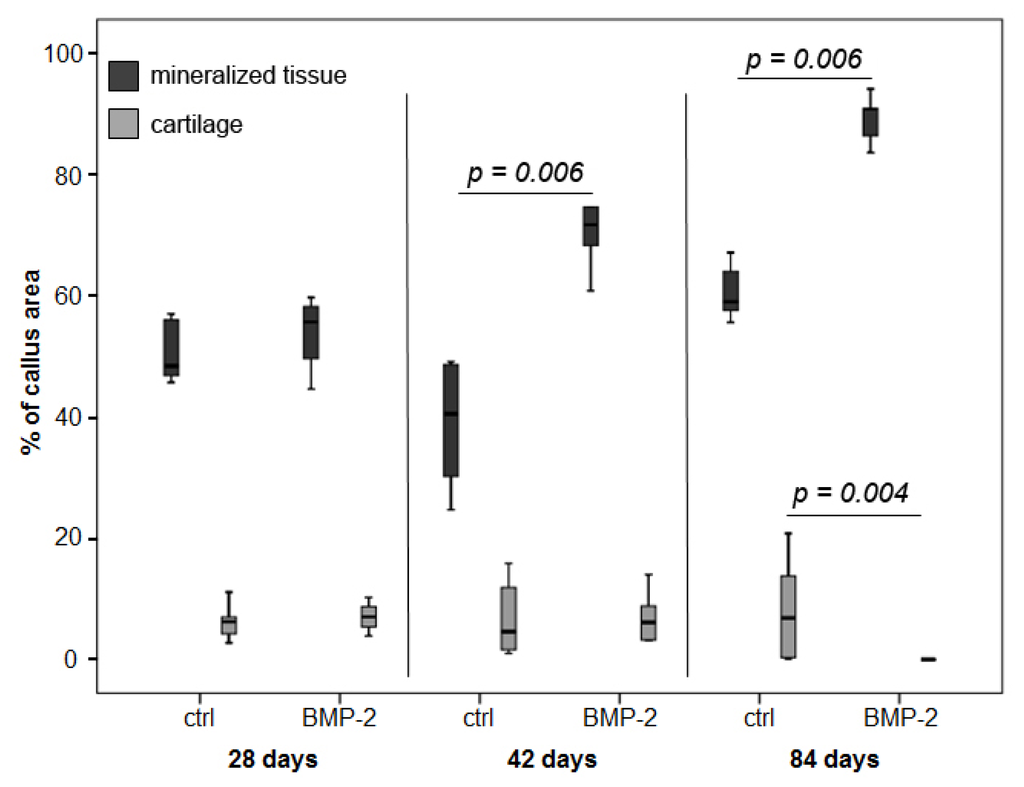 Histomorphometry-based data of the callus composition (mineralized tissue area and cartilage tissue area relative to the total callus area) over time. The mineralization of the callus was significantly enhanced in the BMP-2 group at Days 42 and 84 (p = 0.006), whereas the cartilage area was significantly reduced after BMP-2 treatment at Day 84 (p = 0.004).