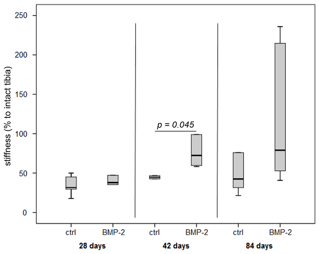 In the BMP-2 group, values steadily rose and biomechanical strength reached 79% compared to the intact bone at Day 84, however, with a high variation. Values between both groups were significantly different at Day 42 (p = 0.045) (Figure 5).