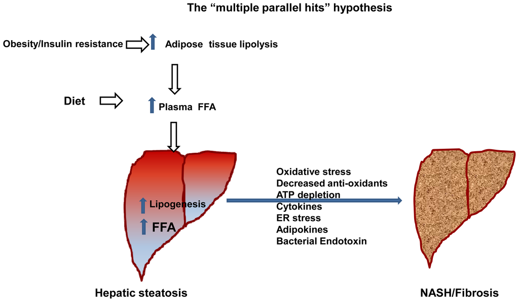 Nonalcoholic fatty liver disease (NAFLD) has evolved as the world’s epidemic and is one of the most common chronic diseases in the United States [,]. NAFLD involves a spectrum of hepatic steatosis, nonalcoholic steatohepatitis (NASH), fibrosis, cirrhosis, and hepatocellular carcinoma (HCC) that occurs in the absence of significant alcohol intake and absence of other viral, genetic and autoimmune components. Hepatic steatosis is defined as liver content exceeding 5% of liver weight [–]. NASH and alcoholic steatohepatitis (ASH) have similar histopathology but different etiology, and epidemiology []. NAFLD affects about 30% of the general population in western society, and is recognized as the most common cause of liver dysfunction worldwide []. A 2%–3% subset of patients with NAFLD develop NASH, and 5%–8% of NASH patients develop liver cirrhosis within five years [,]. In addition to genetic risk factors, NAFLD prevalence is aggravated by changes in life style including physical inactivity as well as consumption of high fat and high fructose corn syrup diet []. NAFLD is considered as the hepatic manifestation of the metabolic syndrome, which is defined by the presence of central obesity, insulin resistance, hyperlipidemia, hyperglycemia, and hypertension [–]. NAFLD increases with obesity and type 2 diabetes; it is present in up to 90% of obese individuals [,,]. Insulin resistance is a common causative factor in the pathogenesis of NAFLD and type 2 diabetes, but the underlying mechanisms are far from been understood. NAFLD is a condition that contributes to the metabolic syndrome. Accumulation of the “bad fat” (such as free fatty acids (FFAs), diacylglycerols and ceramides) in hepatocytes in NASH causes insulin resistance, which in turn contributes to type 2 diabetes. Conversely, type 2 diabetes may contribute to NASH, thus creating a vicious circle [,]. Type 2 diabetes is associated with liver fibrosis and progression to cirrhosis and HCC []. NAFLD is also present in 3%–10% of children; this proportion increases to 50% in obese children in western society []. The disease has been described in individuals of all races, in both genders, and also in non-obese subjects [–]. There are differences in NAFLD prevalence between various race/ethnic groups. Compared to Caucasian and Hispanic adults, African Americans are protected from the hepatic accumulation of fat []. Insulin resistance, oxidative stress, and inflammatory cascades are believed to play a central role in the pathogenesis of NAFLD []. Despite the progress gained into understanding how fat accumulates in the liver, the pathogenesis of advanced forms of NAFLD remains to be elucidated. Several hypotheses have been proposed recently. According to the original hypothesis (the “two hit”) hypothesis, NAFLD is a progressive disease in which insulin resistance (“the first hit”) leads to increased FFA flux to the liver. If FFAs are not oxidized or secreted, hepato-steatosis develops []. Hepatic steatosis predisposes the liver to “second hits” such as mitochondrial dysfunction, cytokines, adipokines, ER stress and bacterial endotoxins. This original hypothesis has been modified to suggest that NAFLD may be a consequence of parallel “multi-hits” []. In this model, insulin resistance leads to increased lipogenesis and increased uptake of FFAs into the liver. Lipotoxicity sensitizes the liver to injury by “multiple parallel hits” (oxidative damage, activation of fibrogenic pathways, activation of hepatic stellate cells, altered expression of adipokines) leading to NASH and fibrosis (Figure 1). More recently a new theory, the “distinct-hit”, has been proposed to suggest distinct pathogenic pathways for hepatic steatosis and NASH [,,]. In general, an association exists between NAFLD and insulin resistance with the exception of some specific genetic conditions affecting lipid metabolism [,–]. A more recent study suggests that metabolic derangements may start early in life, even in utero. Exposure to excess fuel in fetal life may lead to NAFLD in the offspring [].