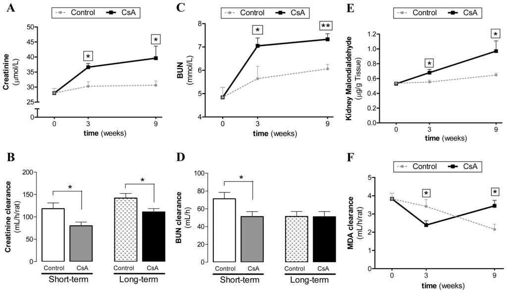 Serum, urine and kidney markers of renal function. Creatinine serum levels (A) and clearance (B); blood urea nitrogen (BUN) levels (C) and clearance (D); kidney lipid peroxidation evaluated by the malondyaldehyde content (E); malondyaldehyde clearance (F) throughout the short- and long-term Cyclosporin A (CsA) treatments. Values are mean ± SEM. * p < 0.05 and ** p < 0.01 vs. the Control group.