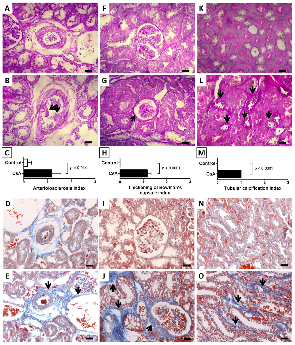Kidney lesions. Representative photomicrographs of kidney histological sections stained with periodic acid of Schiff (PAS), for Control (A,F,K) and CsA (B,G,L) groups in the long-term CsA treatment model; (A) represents a normal kidney arteriole from the control group and (B) an arteriolosclerosis lesion present in all the rats treated with CsA, indicated by the two arrows; (F,G) represent a normal capsule and a thickening Bowman’s capsule (black arrow) from the CsA group, respectively; (K,L) show a normal tubules and tubular calcification (black arrows) in control and CsA-treated rats, respectively; (C,H,M) represent the index of each kidney lesion for the Control and CsA groups; Representative photomicrographs of kidney histomorphologic sections with Masson’s trichrome staining for Control (D,I,N) and CsA (E,J,O) groups in the long-term CsA treatment model, showing the pattern of collagen deposition (blue color); (D,I,N) show normal vascular, glomerular and tubulointerstitial regions of the control rats; (E) presents an arteriolosclerosis lesion and collagen deposition around vessels (black arrows) CsA-treated rats; (J,O) show collagen deposition around Bowman’s capsule and tubules (black arrows) and tubule-interstitial fibrosis (black arrows) from the CsA-treated group, respectively. Each bar represents 25 μm.