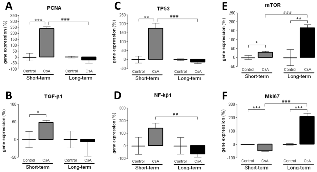 Kidney gene (mRNA) expression of markers of proliferation. PCNA (A); TGF-β1 (B); TP53 (C); NF-κB (D); mTOR (E) and Mki67 (F) for the control and CsA treatments, in the short- and long-term models. Values are mean of % of the control ± SEM. * p < 0.05, ** p < 0.01 and *** p < 0.001 vs. the Control group of each model; ## p < 0.01 and ### p < 0.001 vs. the CsA-acute model. Mki67, antigen identified by monoclonal antibody Ki-67; mTOR, mammalian target of rapamycin; NF-κB1, nuclear factor kappa B; PCNA, proliferating cell nuclear antigen; TGF-β1, transforming growth factor beta 1; TP53, tumor protein p53.