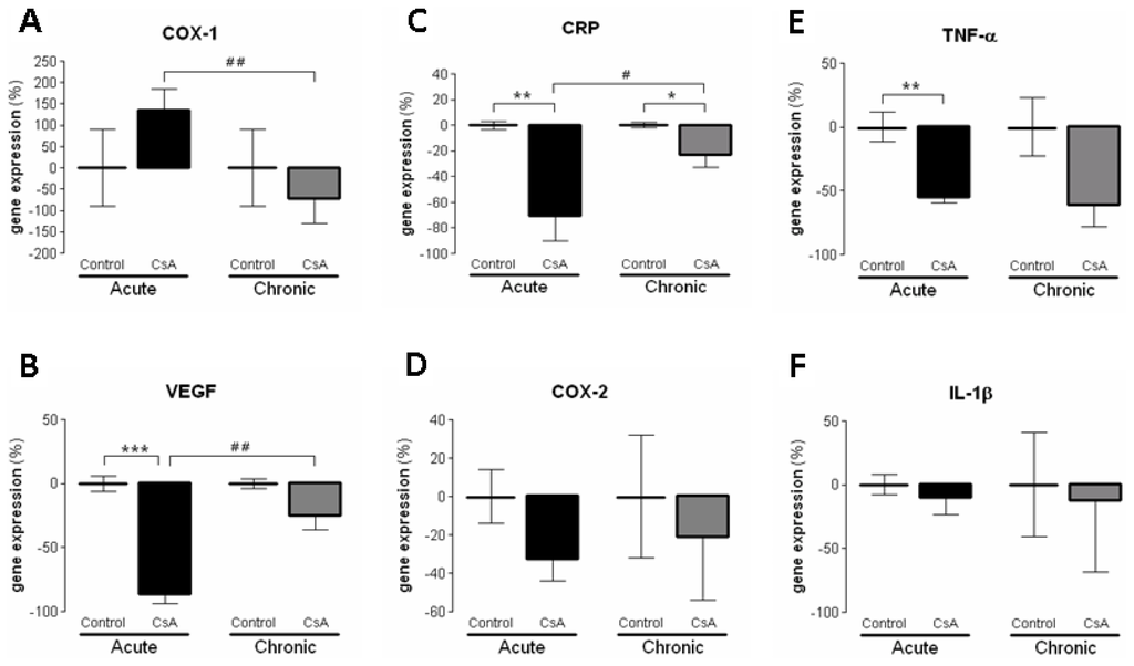 Kidney gene (mRNA) expression of markers of inflammation and angiogenesis. COX-1 (A); VEGF (B); CRP (C); COX-2 (D); TNF-α (E) and IL-1β (F) for the control and CsA treatments, in the short- and long-term models. Values are mean of % of the control ± SEM. * p < 0.05, ** p < 0.01 and *** p < 0.001 vs. the Control group of each model; # p < 0.05 and ## p < 0.01 vs. the CsA-acute model. COX-1, ciclooxigenase-1; COX-2, ciclooxigenase-2; CRP, C-reactive protein; IL-1β, interleukin 1 beta; TNF-α, tumor necrosis factor alpha.