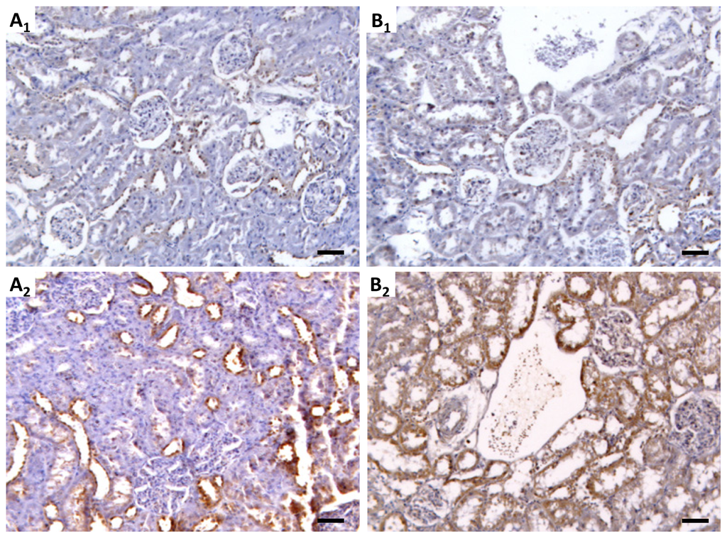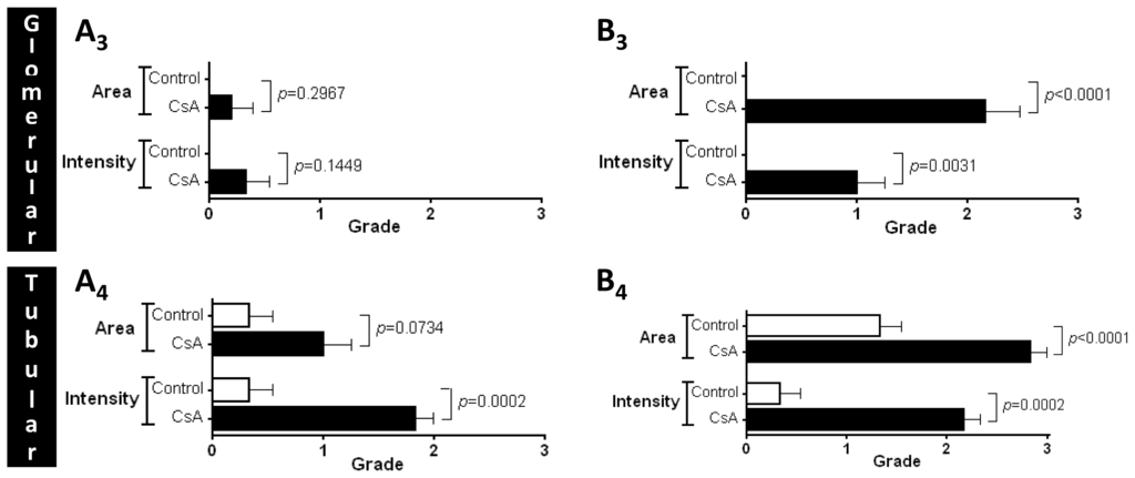 In agreement with the mRNA results, mTOR protein expression was increased in the CsA-treated rats, with a moderate increment after the short-term treatment, with grade 1 staining area (25%–50%) and grade 2 intensity (Figure 5A4) in the tubular region, without significant area and staining intensity in the glomerular field (Figure 5A3). More pronounced expression under a long-term CsA treatment was observed, with >75% of staining area (grade 3) and grade 1 intensity (Figure 5B3) in the glomeruli and with >75% of staining are (grade 3) and grade 2 intensity (Figure 5B4) in the tubulointerstitial region, both compared with the corresponding control rats of the 3 and 9 weeks, both demonstrating no staining (Figure 5A1,B2).