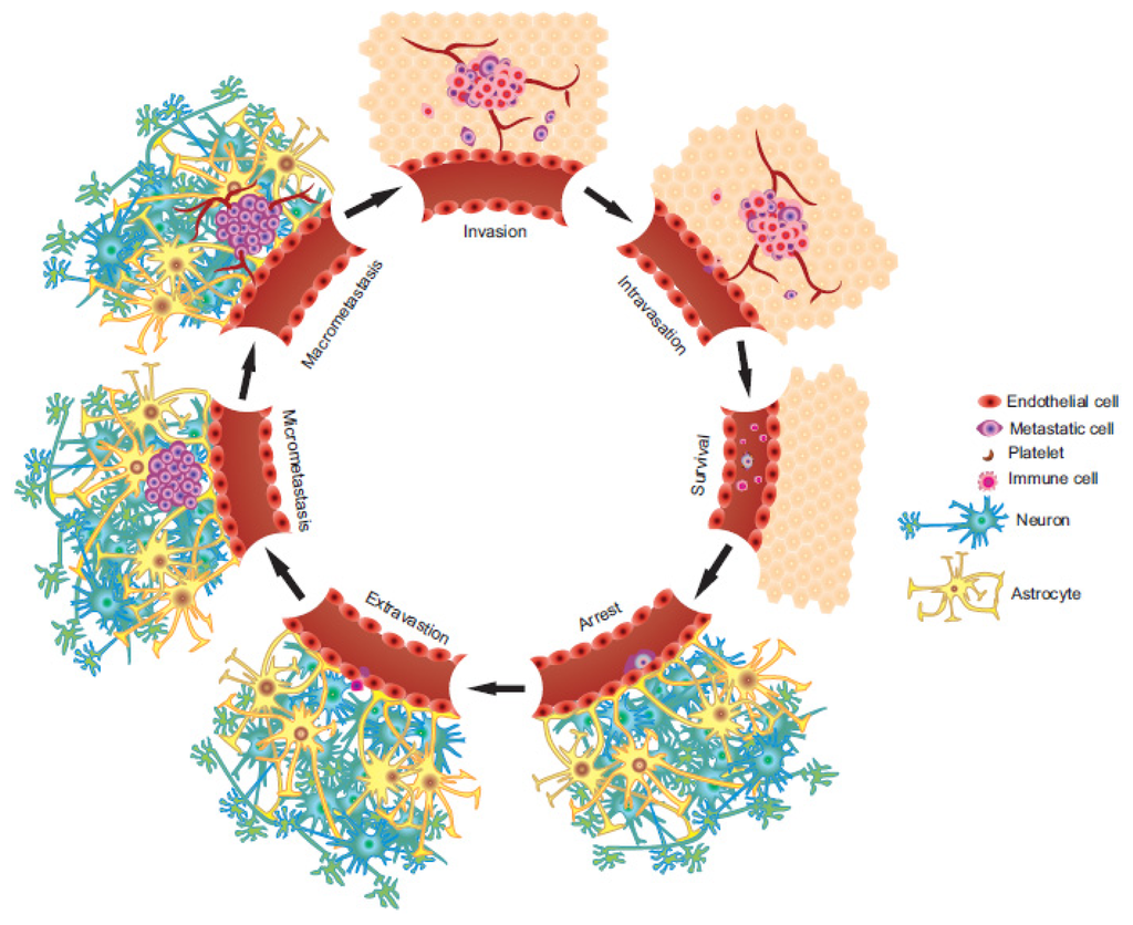 Stages of brain metastasis (BM). The general stages involved in the metastatic process.