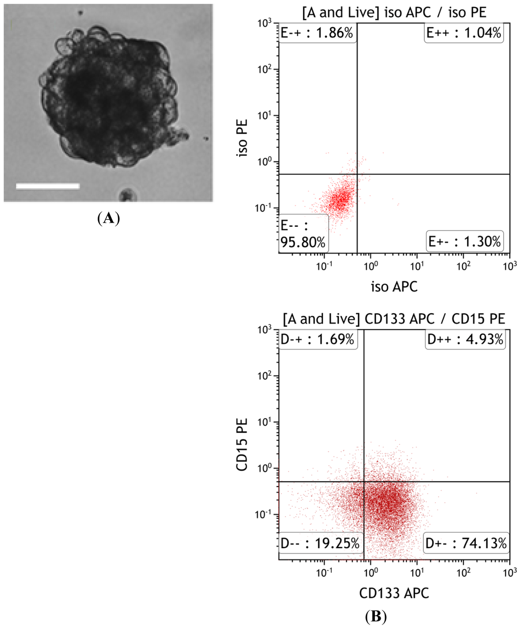 Characteristics of brain metastasis-initiating cells. (A) BM from the lung possess a cancer stem cells (CSCs) in vitro (100× magnification, 100 μm). Patient-derived BM samples were grown as tumorspheres in neural stem cell media; (B) CSC marker (i.e., CD133 and CD15) expression assessed by flow cytometry.