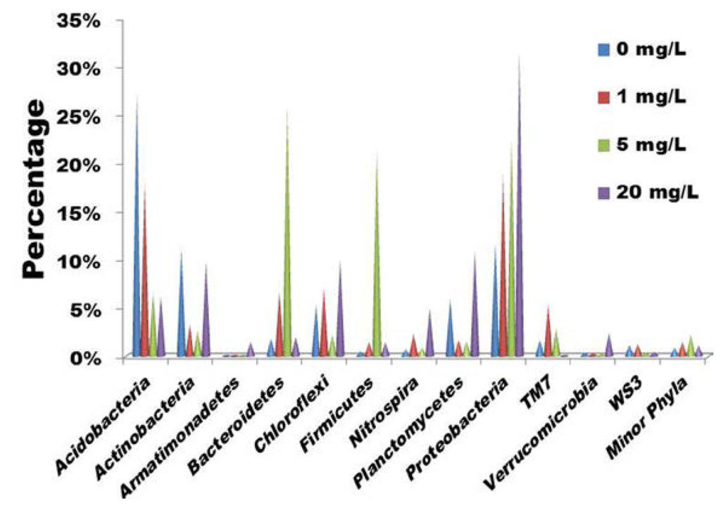 As shown in Figure 1, Acidobacteria (27.3%) was the most abundant phylum in the sludge without tetracycline treatment, followed by Proteobacteria (11.6%), Actinobacteria (11.2%), Planctomycetes (5.9%), Chloroflexi (5.3%), Bacteroidetes (1.8%), TM 7 (1.7%), WS3 (1.1%), Nitrospira (0.7%) and Firmicutes (0.5%). Lozada et al. [22] also indicated that Proteobacteria and Acidobacteria were dominant in surfactant-enrichment lab-scale activated sludge. Acidobacteria, a common and predominant phylum in sludge [22], seems susceptible to tetracycline since the phylum abundance decreased from 27.3% under no tetracycline stress to 6.2% with 20 mg/L tetracycline treatment. Actinobacteria and Planctomycetes were also susceptible to tetracycline since their abundance evidently decreased with the increase of tetracycline concentration. On the contrary, tetracycline treatment dramatically increased the abundance of Proteobacteria in the sludge. Bacteriodetes and Firmicutes seemed to have higher abundance after 5 mg/L tetracycline treatment, but had lower abundance after 20 mg/L tetracycline treatment.