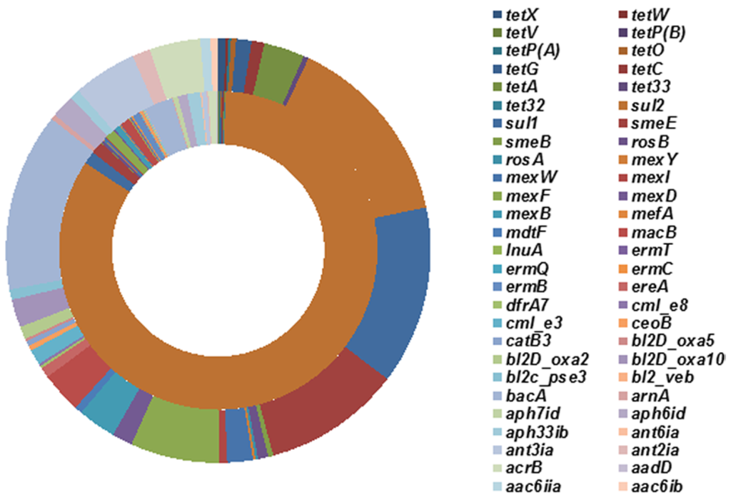 To investigate the impact of tetracycline stress on the abundance of ARGs, the sludge samples fed with 0 and 20 mg/L tetracycline were selected for Illumina high-throughput sequencing. Alignments of the Illumina reads against the Antibiotic Resistance Genes Database (ARDB) showed that a total of 2168 reads (0.0192%) from the sludge under no tetracycline stress and 515 reads (0.0043%) from the sludge fed with 20 mg/L tetracycline were annotated as 47 and 41 types of known ARGs, respectively (Figure 3). As a common hypothesis, ARGs may have higher abundance in the presence of antibiotics [35].