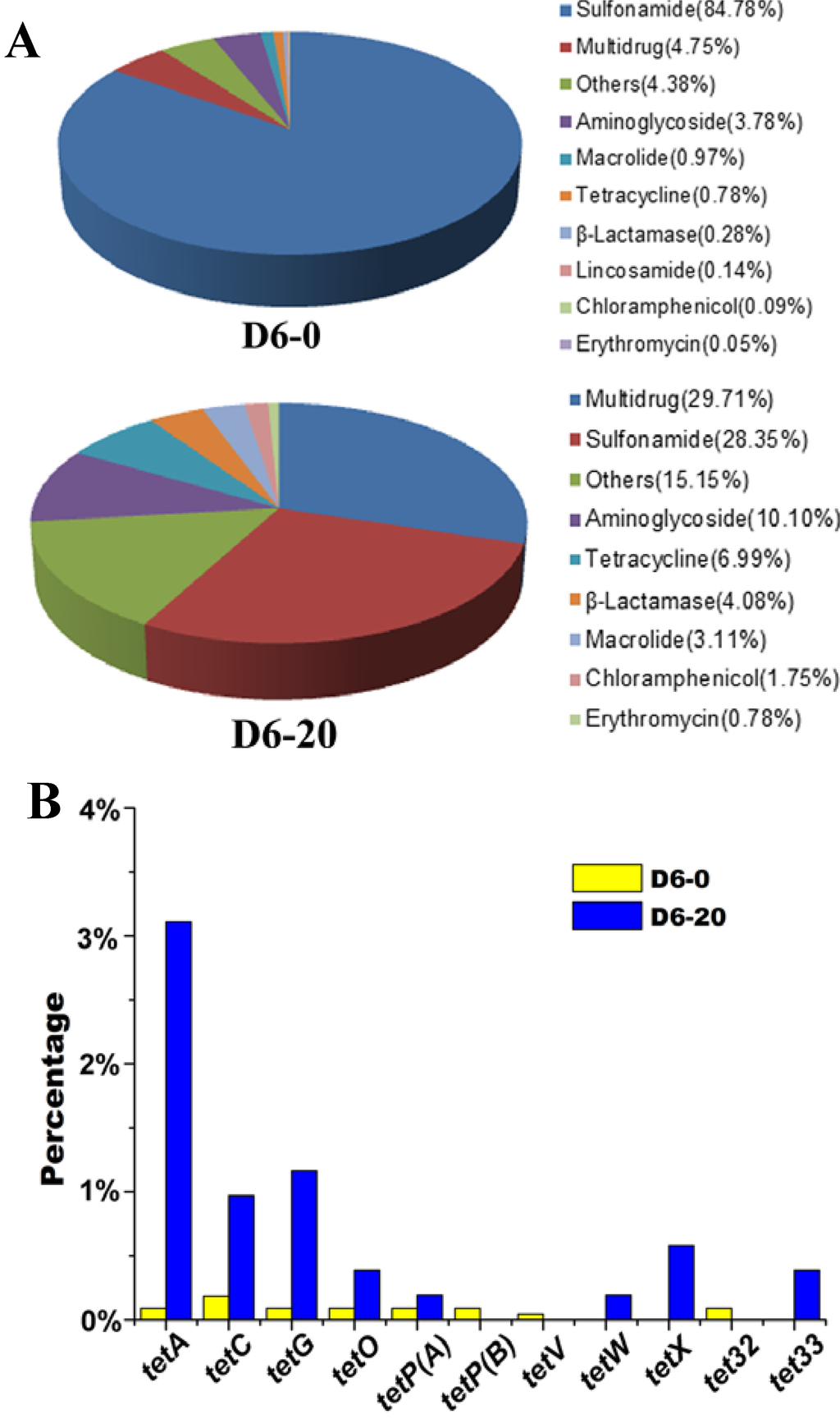 Antibiotic resistance patterns (A) and tet genes (B) in sludge treated with 0 mg/L (D6-0) and 20 mg/L (D6-20) tetracycline. The resistance genes identified were grouped according to antibiotic types after alignment of the high-throughput sequencing reads against antibiotic resistance database (ARDB). D6-0: sludge incubated with 0 mg/L tetracycline for 6 days; D6-20: sludge incubated with 20 mg/L tetracycline for 6 days.