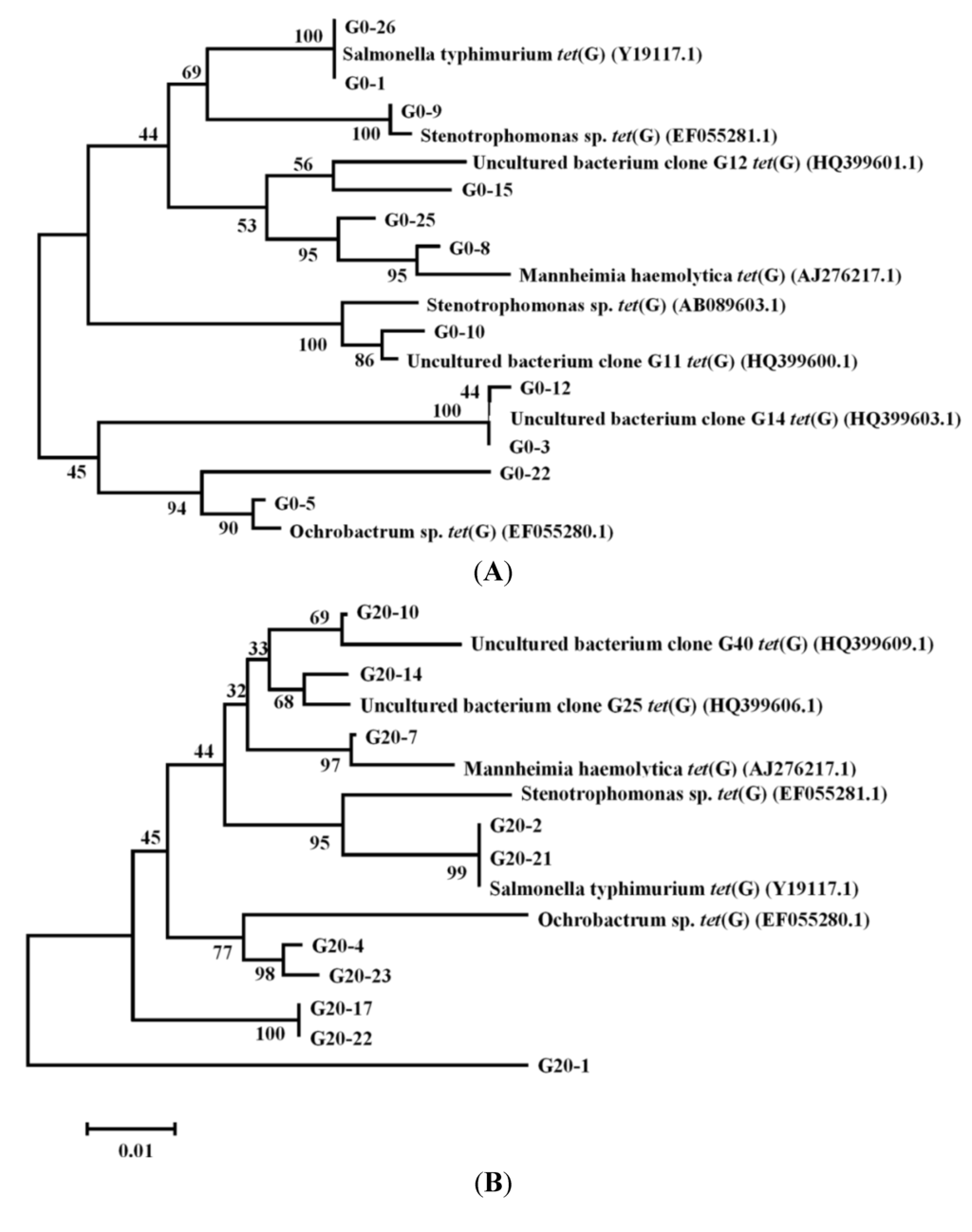 Neighbor-joining phylogenetic analysis of tetG diversity in activated sludge of D6-0 (A) and D6-20 (B). The tree was constructed using MEGA version 5.05 and bootstrap analysis with 1000 replicates was used to evaluate the significance of the nodes. D6-0: sludge fed with 0 mg/L tetracycline for 6 days; D6-20: sludge fed with 20 mg/L tetracycline for 6 days.