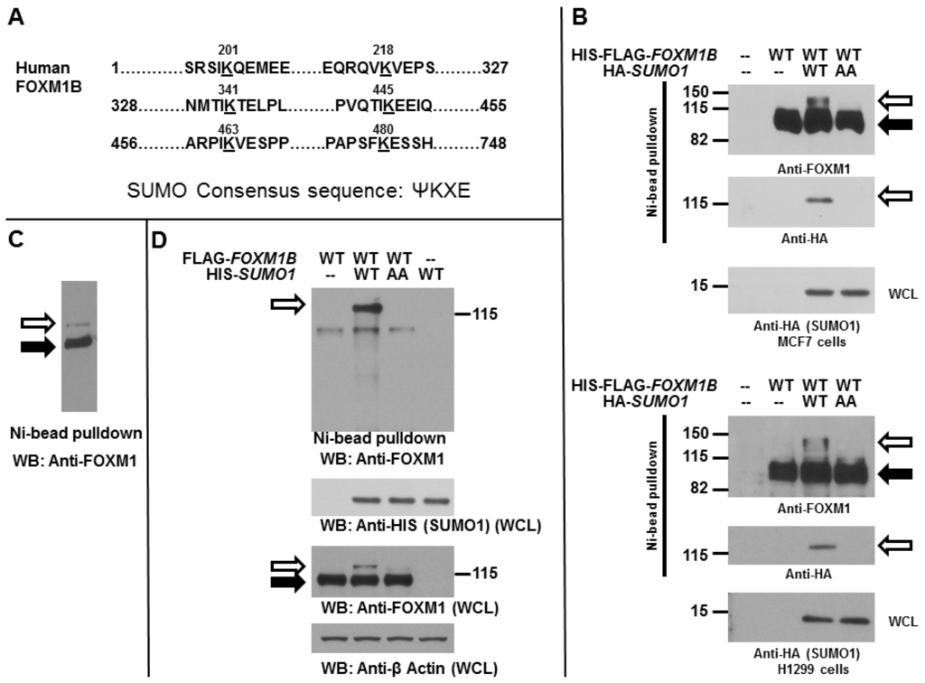FOXM1B can be SUMOylated. (A) Sequence of the human FOXM1B protein showing the regions that contain the potential SUMO sites (K201, K218, K341, K445, K463, and K480). Abbreviations: FOXM1, Forkhead Box Protein M1; SUMO, small ubiquitin-related modifier; (B) MCF7 (upper) and H1299 (bottom) cells were transiently transfected with 3 µg HIS-FLAG-tagged WT FOXM1B and 2 µg HA-SUMO1 (WT or AA mutant) expression plasmids as indicated. After 48 h, cells were harvested and the cell lysates were subjected to Ni2+ bead pulldown, followed by anti-FOXM1 or anti-HA immunoblotting. Whole cell lysates (WCL) were subjected to anti-HA immunoblotting for SUMO1 expression. The empty arrows indicate SUMOylated FOXM1B; The solid arrows indicate non-SUMOylated FOXM1B; (C) MCF7 cells were transiently transfected with 3 µg HIS-tagged WT FOXM1B expression plasmids. After 48 h, cells were harvested and the cell lysates were subjected to Ni2+ bead pulldown, followed by anti-FOXM1 immunoblotting. The empty arrows indicate SUMOylated FOXM1B; The solid arrows indicate non-SUMOylated FOXM1B; (D) MCF7 cells were transiently transfected with 2 µg FLAG-tagged WT FOXM1B and 2 µg HIS-SUMO1 (WT or AA mutant) expression plasmids as indicated. After 48 h, cells were harvested and the cell lysates were subjected to Ni2+ bead pulldown, followed by anti-FOXM1 immunoblotting. WCL were subjected to anti-HA, anti-FOXM1, or anti-β-Actin immunoblotting for SUMO1, FOXM1B, or β-Actin expression, respectively. The empty arrows indicate SUMOylated FOXM1B; The solid arrows indicate non-SUMOylated FOXM1B.