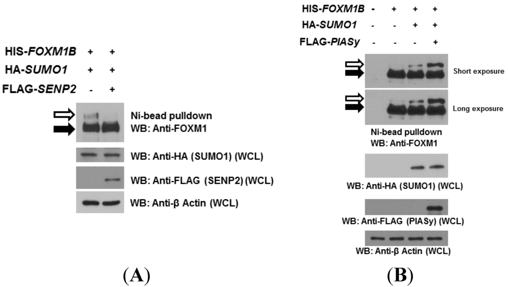 2.2. SUMOylation of FOXM1B Is Modulated by SENP2 and PIASy